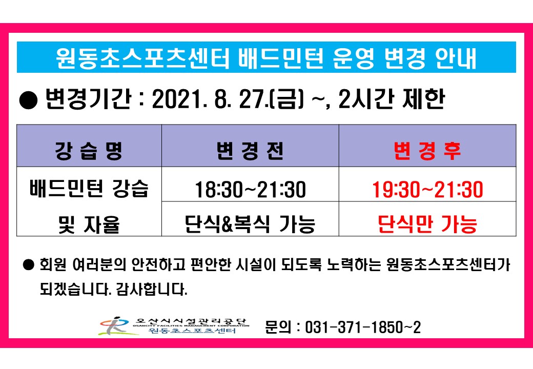 배드민턴 운영을 아래와 같이 조정하게 되었음을 알려드립니다.