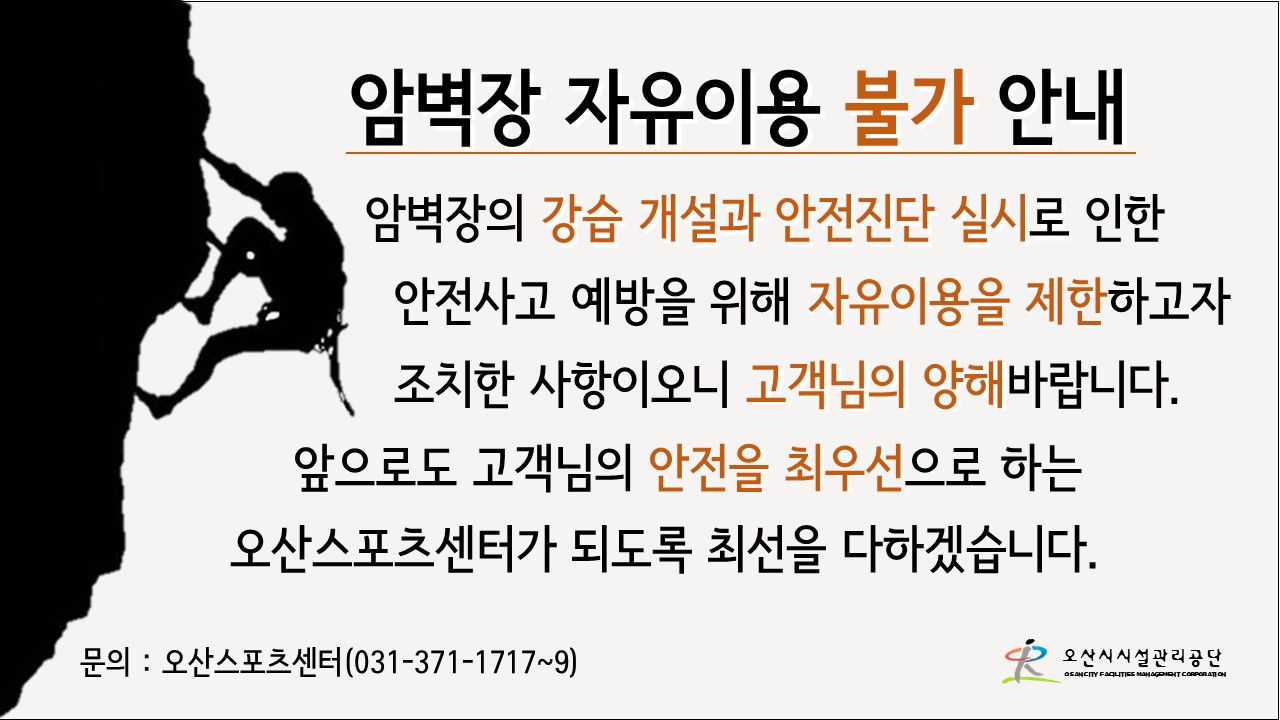 오산스포츠센터 암벽장 자유이용 불가 안내 작성자 최고관리자 등록일자 2018년 12월 20일 13시 18분 10초 조회 499 암벽장 자유이용 불가 안내.jpg [ Size : 149.39KB , Down : 235 ] 미리보기 다운로드 목록보기