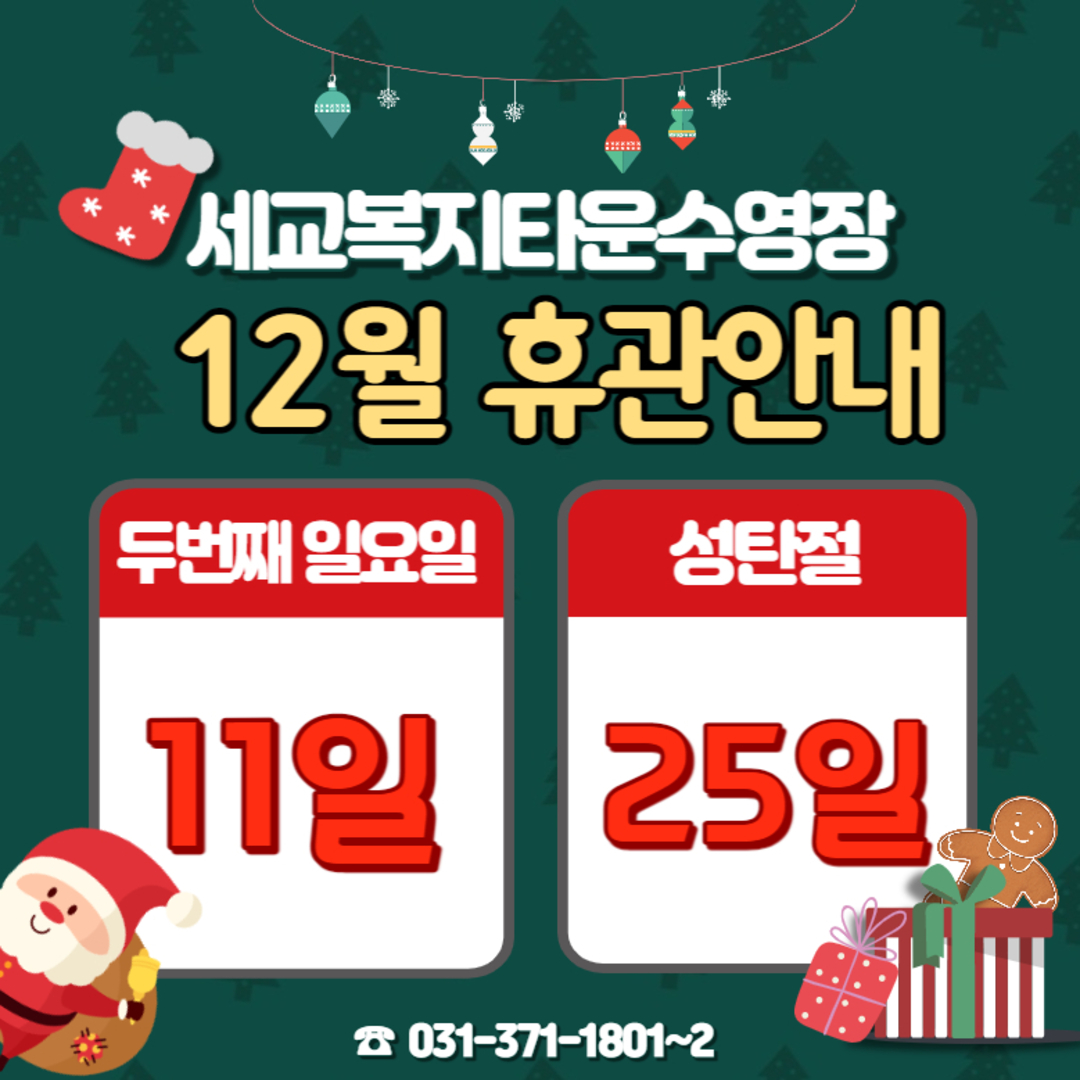 세교복지타운 수영장 12월 휴관일 안내 작성자 osansisul01 등록일자 2022년 11월 29일 10시 26분 47초 조회 281 12월 휴관(웹용).jpg [ Size : 517.87KB , Down : 313 ] 미리보기 다운로드 목록보기