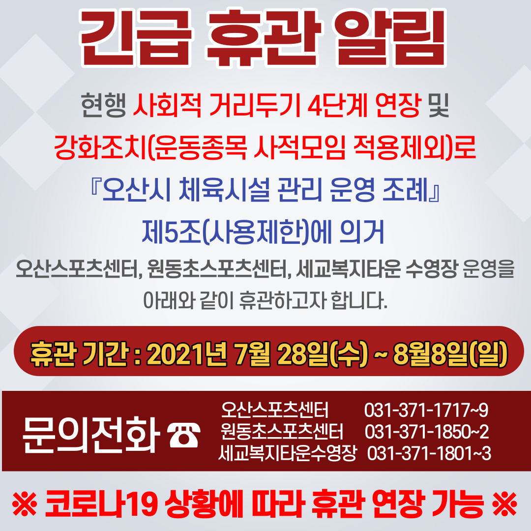 관내 확진자 증가 추이에 따라 오산시민의 안전을 위해 임시휴관을 결정하게 되었으며,