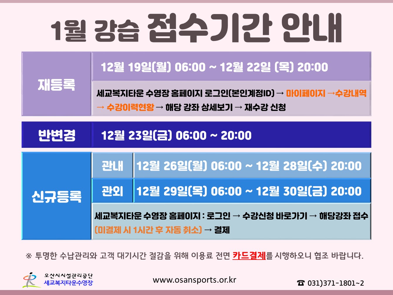 세교복지타운 수영장 1월 강습 접수기간 안내 작성자 osansisul01 등록일자 2022년 12월 5일 13시 6분 17초 조회 656 23.1월 접수기간 안내.jpg [ Size : 230.89KB , Down : 963 ] 미리보기 다운로드 목록보기