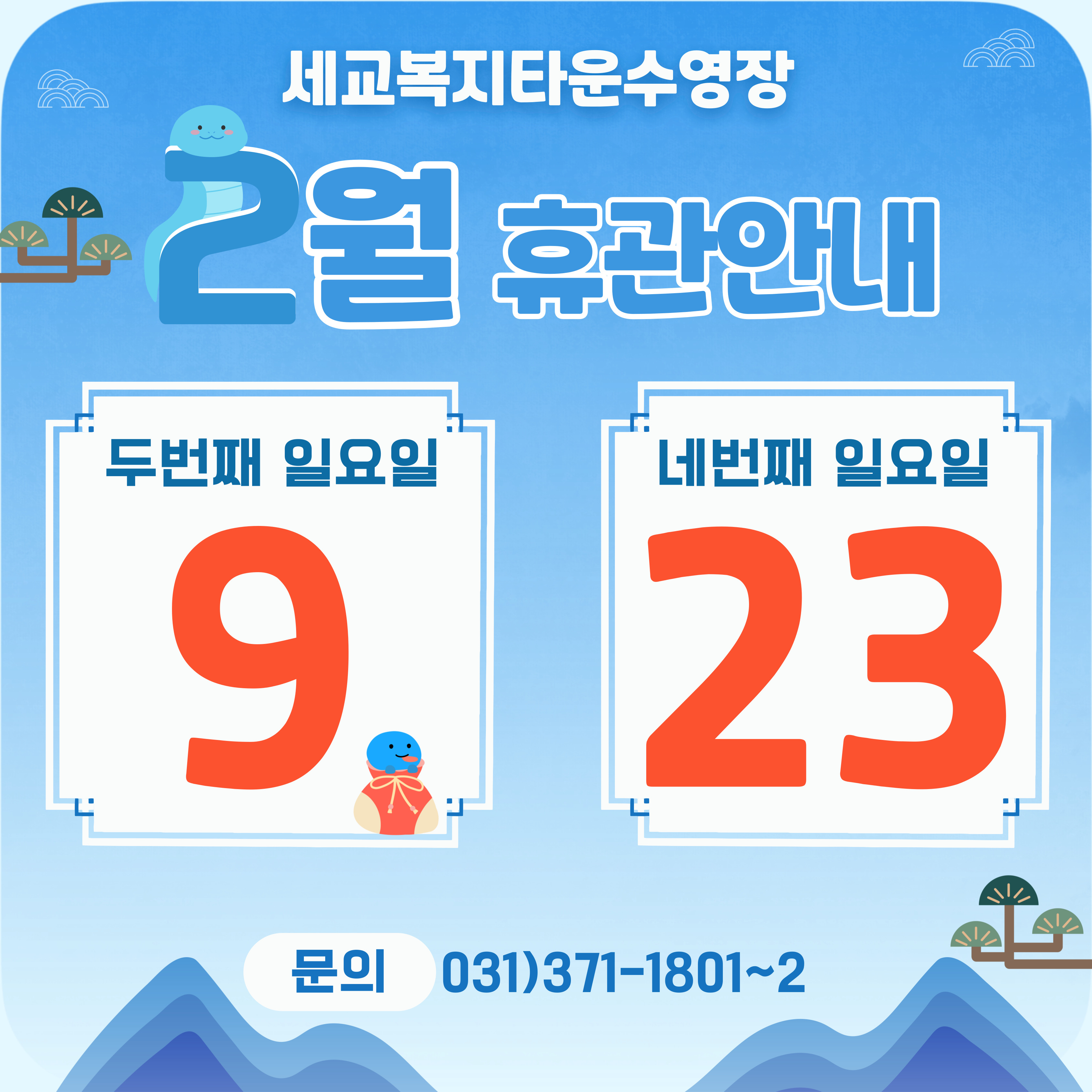 세교복지타운 수영장 [세교] 2월 휴관 안내 작성자 osansisul01 등록일자 2025년 1월 31일 9시 38분 50초 조회 683 2월 휴관안내.jpg [ Size : 1.08MB , Down : 822 ] 미리보기 다운로드 목록보기