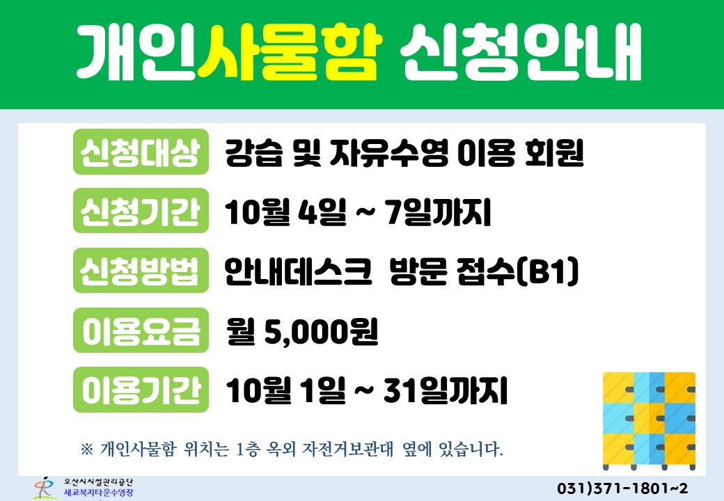 세교복지타운 수영장 10월 개인사물함 신청 안내 작성자 osansisul01 등록일자 2022년 9월 29일 15시 49분 3초 조회 213 10월 개인사물함 안내.jpg [ Size : 133.04KB , Down : 228 ] 미리보기 다운로드 목록보기