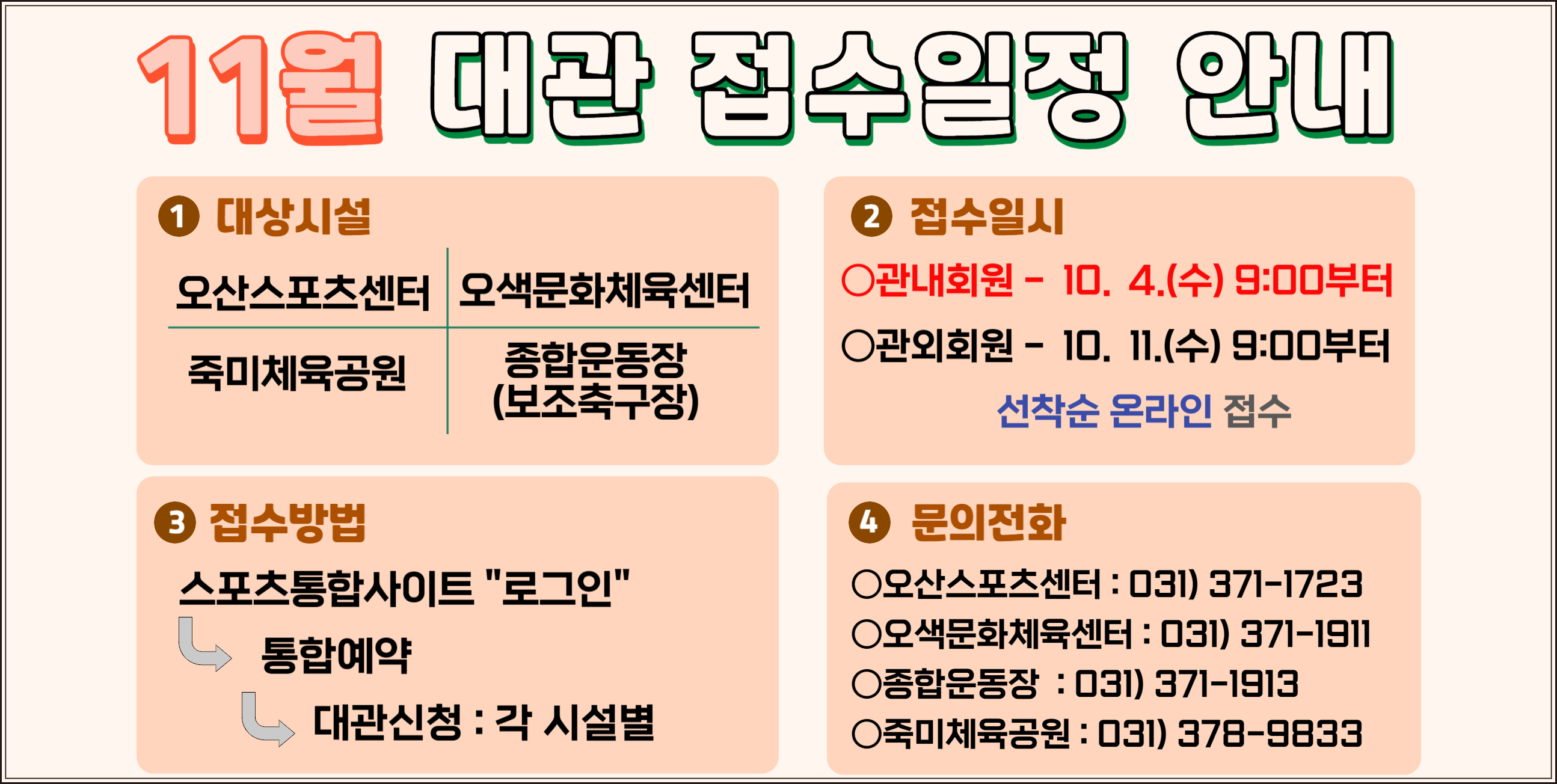 공통 11월 대관 접수일정 안내 작성자 osansisul04 등록일자 2023년 9월 25일 12시 51분 34초 조회 827 . 11월대관안내.jpg [ Size : 1.05MB , Down : 1,254 ] 미리보기 다운로드 목록보기