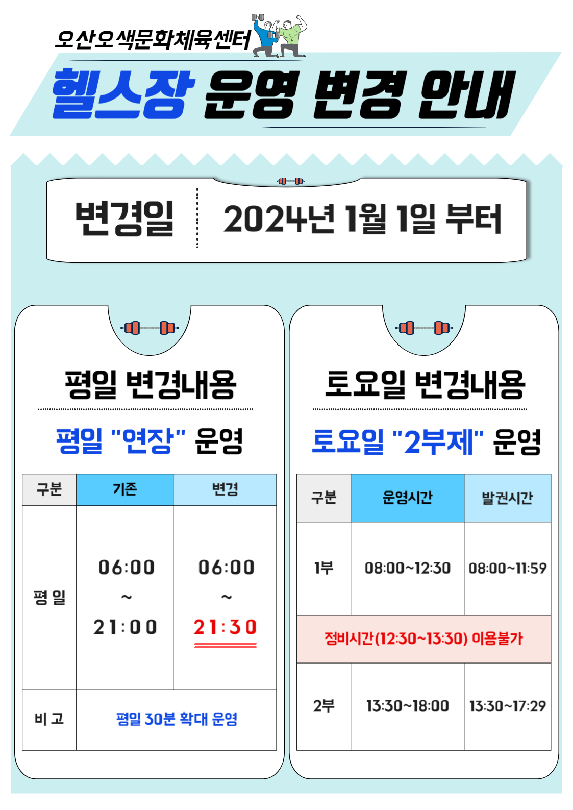 오색문화체육센터 오색문화체육센터 2024년 헬스장 운영 변경 안내(평일확대운영, 토요일2부제운영) 작성자 osansisul04 등록일자 2023년 12월 14일 16시 53분 59초 조회 1,321 . 헬스장운영20231212.jpg [ Size : 478.26KB , Down : 1,989 ] 미리보기 다운로드 목록보기