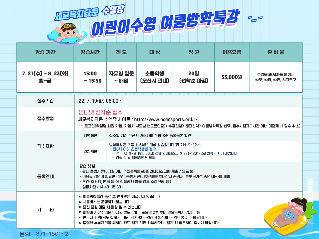 세교복지타운 수영장 세교복지타운 수영장 "어린이 수영 방학특강" 개설 안내 작성자 osansisul01 등록일자 2022년 7월 11일 14시 5분 40초 조회 1,520 세교 여름방학특강 (1).jpg [ Size : 539.77KB , Down : 2,036 ] 미리보기 다운로드 목록보기