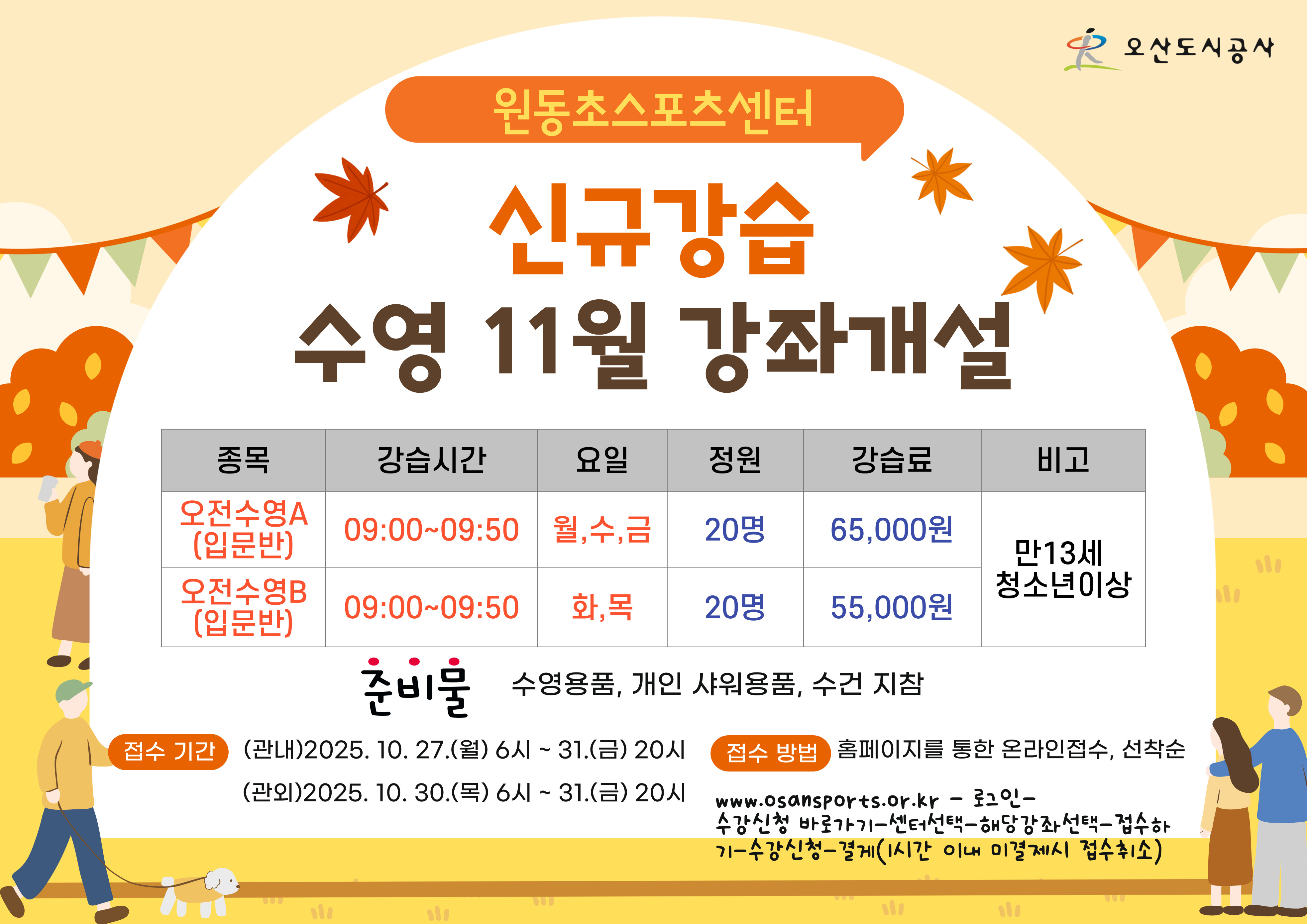 원동초 스포츠센터 [원동] 11월 성인수영 입문반 개설 작성자 osansisul02 등록일자 2025년 10월 17일 9시 39분 10초 조회 1,262 원동초 11월 신규입문반 개설(홈페이지).jpg [ Size : 996.48KB , Down : 1,728 ] 미리보기 다운로드 목록보기