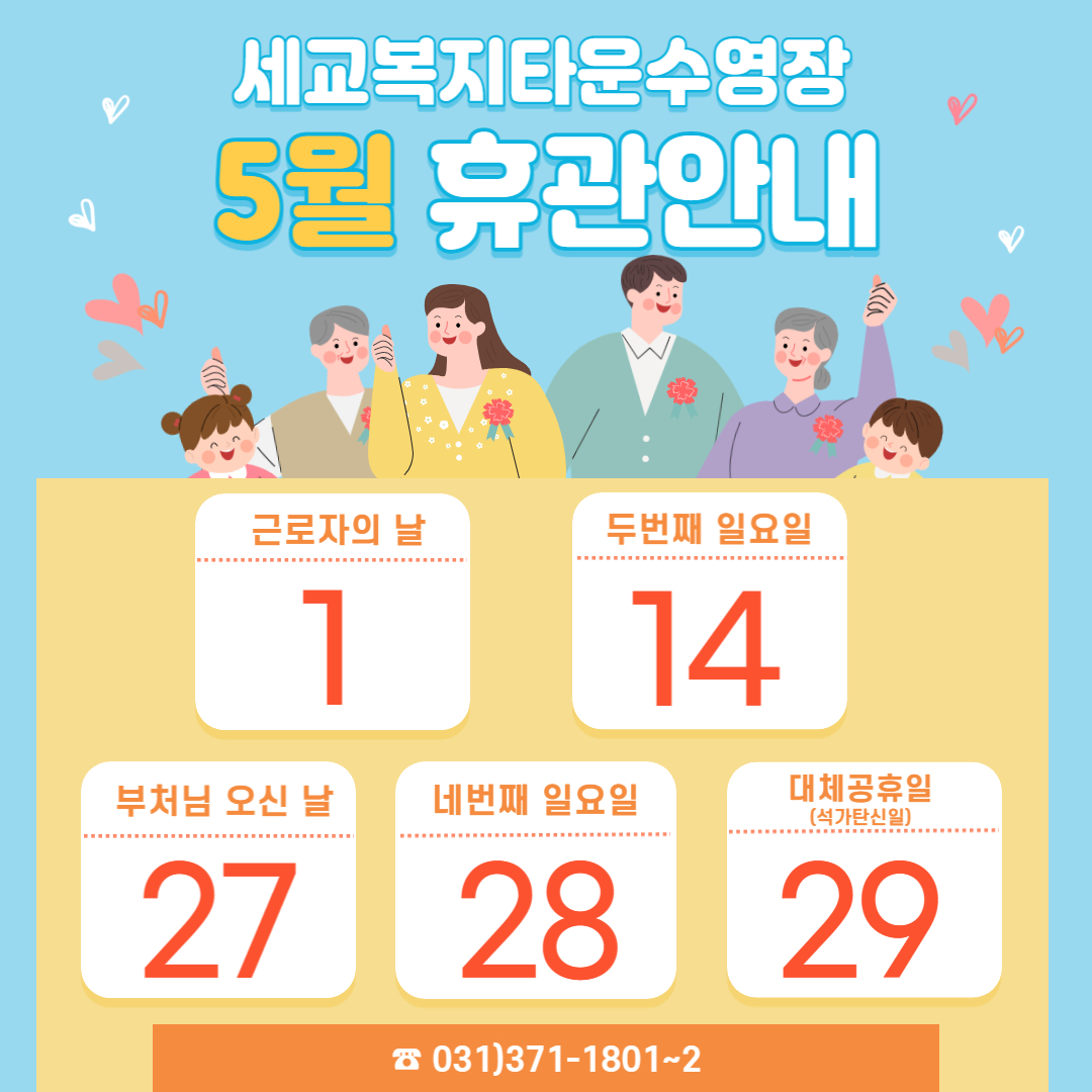 세교복지타운 수영장 5월 휴관일 안내 작성자 osansisul01 등록일자 2023년 4월 20일 14시 52분 5초 조회 334 5월 휴관안내.jpg [ Size : 511.72KB , Down : 406 ] 미리보기 다운로드 목록보기