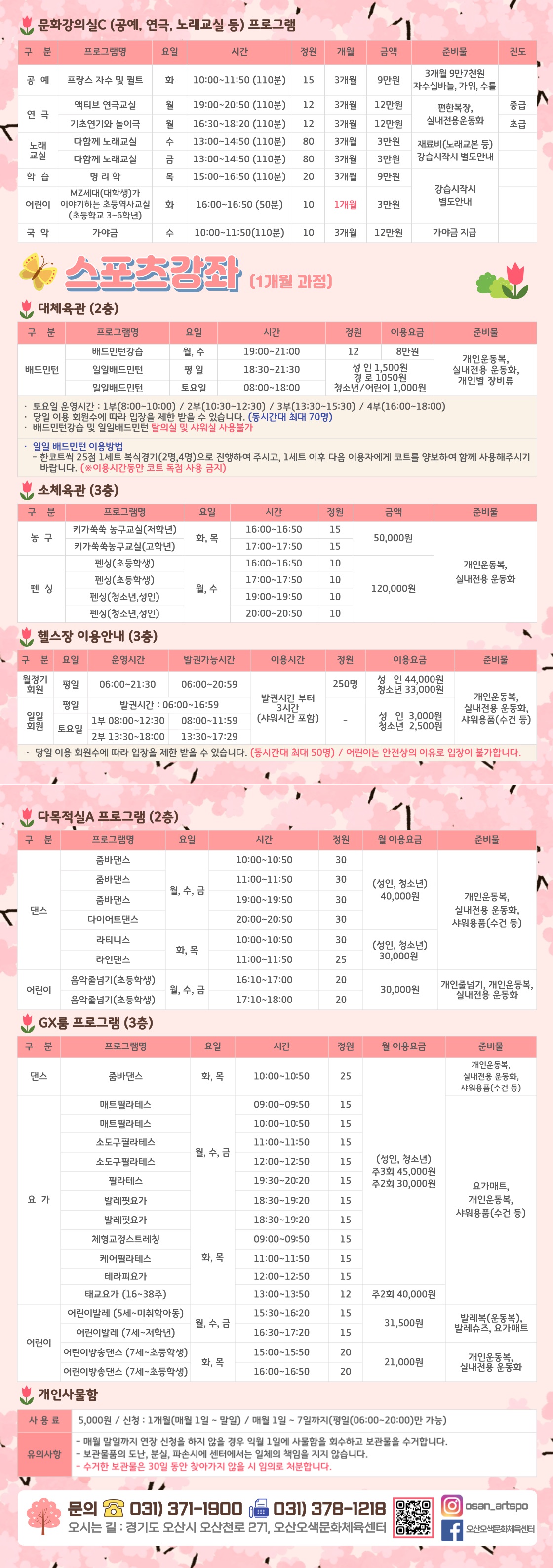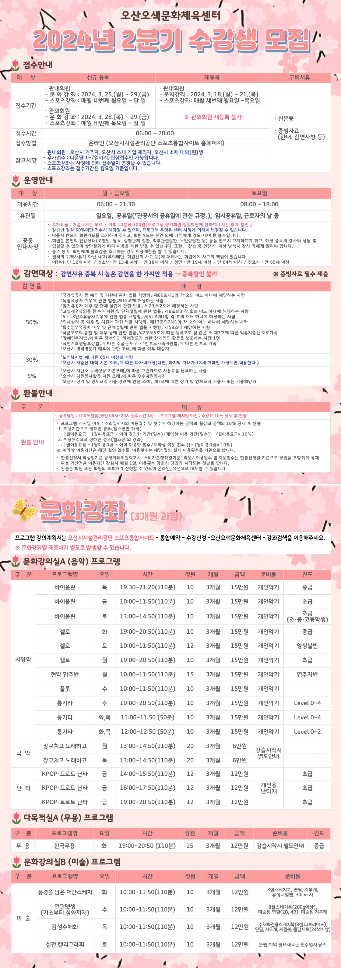 오색문화체육센터 오산오색문화체육센터 2024년 2분기 회원 모집 안내 작성자 osansisul04 등록일자 2024년 3월 12일 9시 48분 40초 조회 2,081 . 2024년 2분기 수강생모집1.jpg [ Size : 961.77KB , Down : 4,274 ] 미리보기 다운로드 2024년 2분기 수강생모집2.jpg [ Size : 845.43KB , Down : 3,543 ] 미리보기 다운로드 목록보기