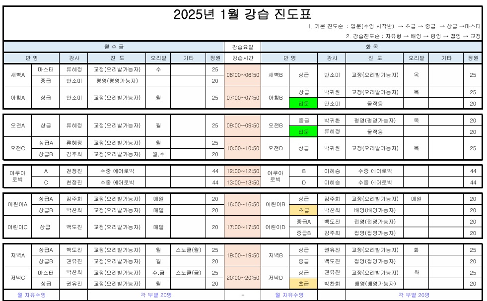 원동초 스포츠센터 [원동] 2025년 1월 강습 진도표 작성자 osansisul02 등록일자 2024년 12월 18일 15시 35분 21초 조회 1,842 진도표.jpg [ Size : 204.4KB , Down : 1,375 ] 미리보기 다운로드 목록보기