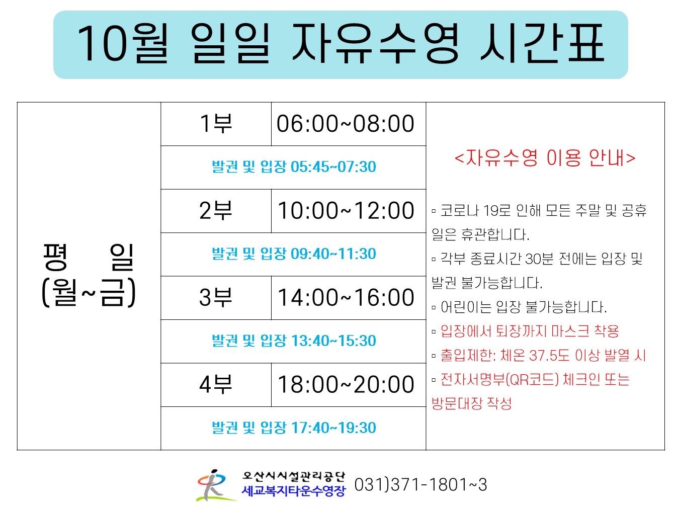 세교복지타운 수영장 10월 일일자유수영 시간 안내 작성자 세교센터관리자 등록일자 2020년 10월 14일 16시 40분 59초 조회 645 자유수영 이용안내.jpg [ Size : 199.57KB , Down : 152 ] 미리보기 다운로드 목록보기