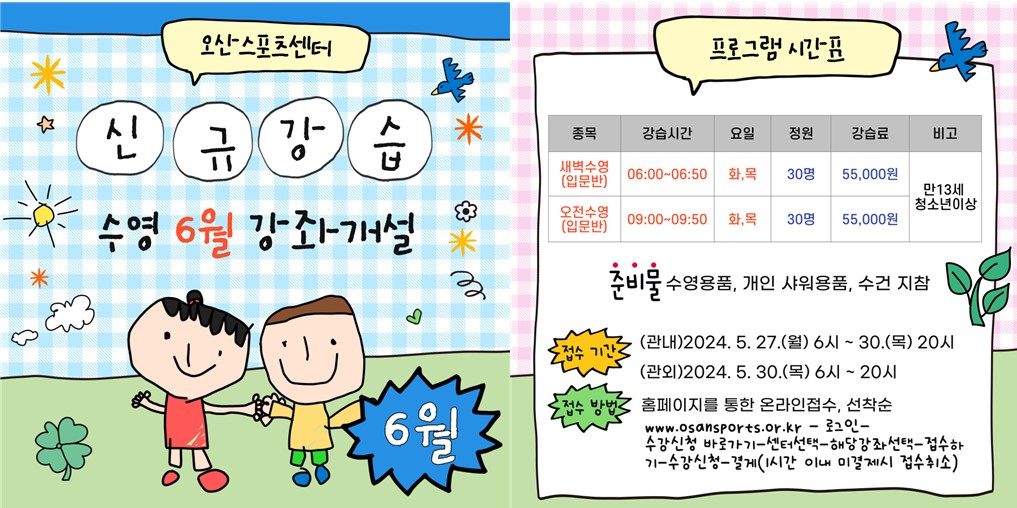오산스포츠센터 (센터) 오산스포츠센터 6월 수영 신규강습 개설안내 작성자 osansisul03 등록일자 2024년 5월 16일 10시 44분 2초 조회 4,926 센터-6월-신규강좌.jpg [ Size : 167.44KB , Down : 8,300 ] 미리보기 다운로드 목록보기