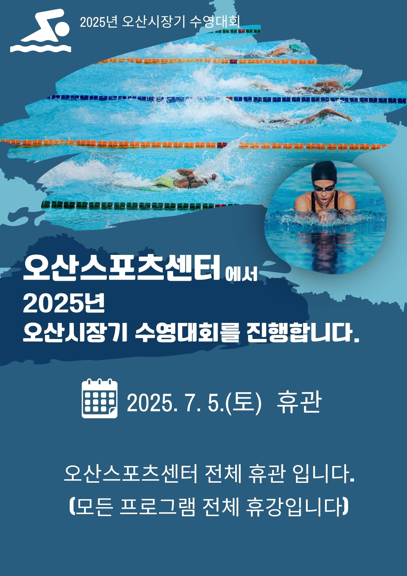 오산스포츠센터 [오산스포츠센터] 2025년 7월 5일(토) 오산시장기 수영대회로 인한 센터 휴관 안내 작성자 osansisul03 등록일자 2025년 6월 16일 13시 33분 12초 조회 2,565 시장기수영대회 휴관안내.jpg [ Size : 322.39KB , Down : 3,064 ] 미리보기 다운로드 목록보기