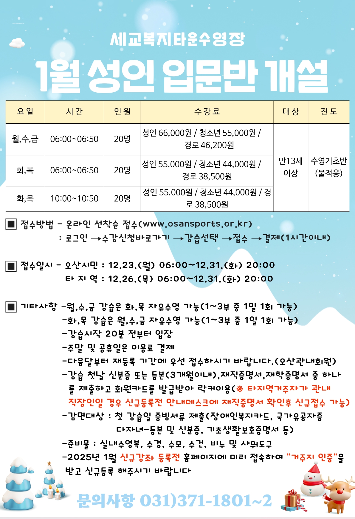 세교복지타운 수영장 [세교] 2025년 1월 성인 입문반 개설 작성자 osansisul01 등록일자 2024년 12월 13일 20시 40분 36초 조회 2,191 1월 성인수영 입문반(크기조정).jpg [ Size : 820.54KB , Down : 3,267 ] 미리보기 다운로드 목록보기