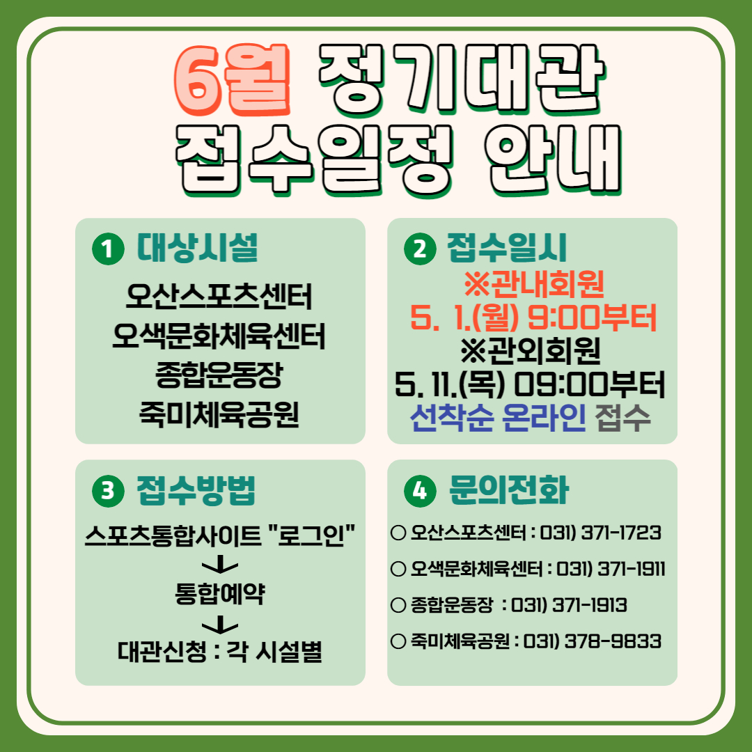 공통 6월 정기대관 일정 안내 작성자 osansisul04 등록일자 2023년 4월 21일 16시 59분 29초 조회 639 . 0421.jpg [ Size : 528.48KB , Down : 679 ] 미리보기 다운로드 목록보기