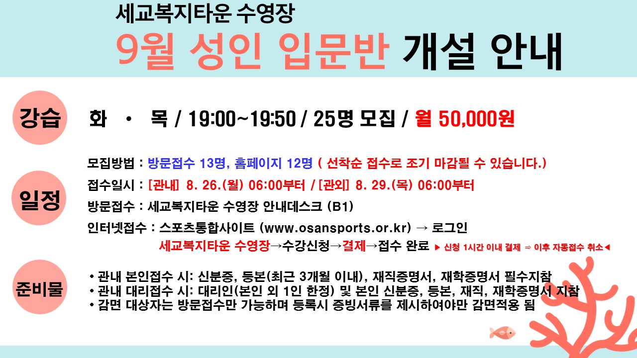 세교복지타운 수영장 9월 성인 입문반 개설 안내 작성자 세교센터관리자 등록일자 2019년 8월 20일 14시 42분 40초 조회 776 9월 성인입문반.jpg [ Size : 198.71KB , Down : 131 ] 미리보기 다운로드 목록보기