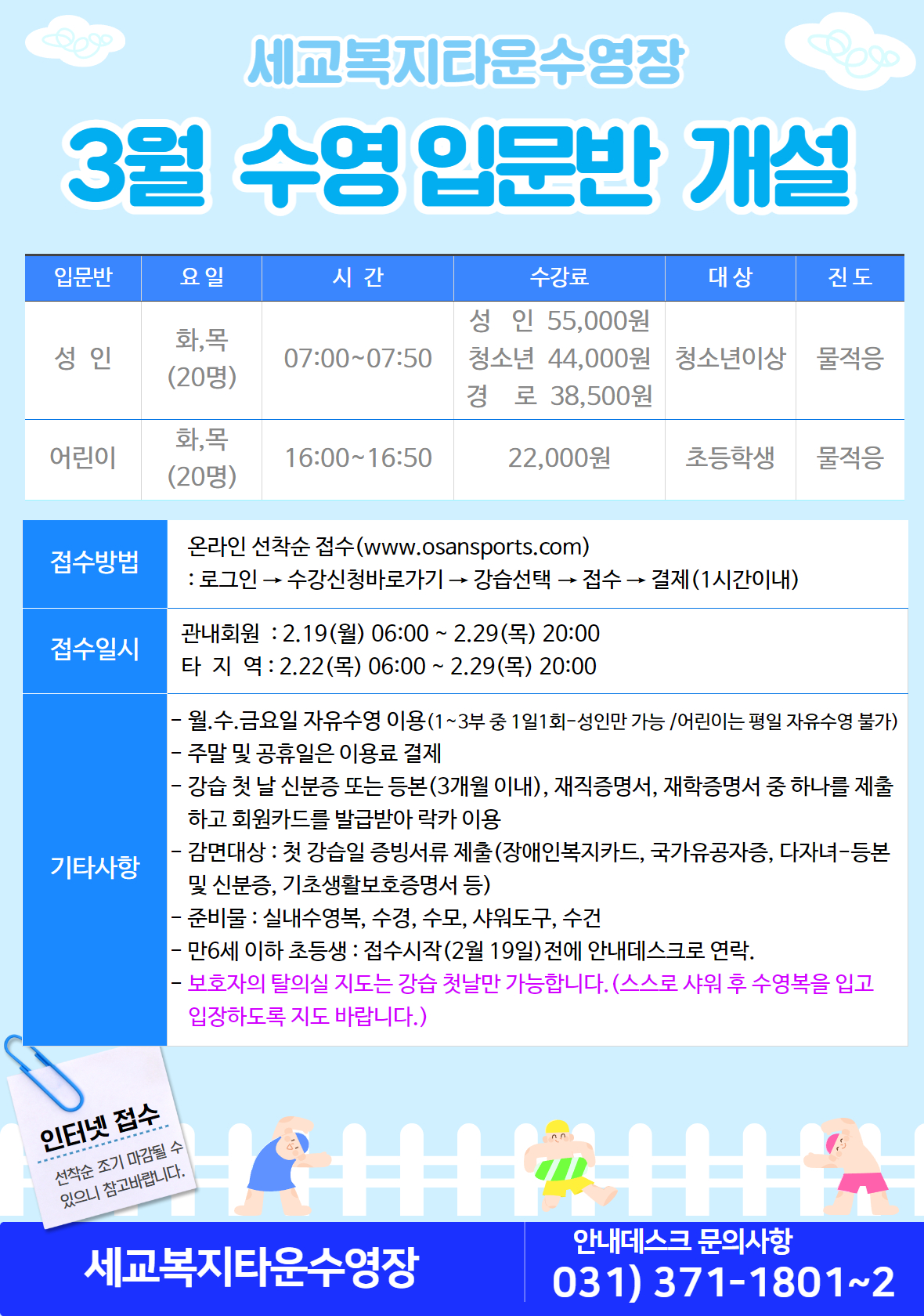 세교복지타운 수영장 [세교]3월 수영 입문반 개설 안내 작성자 osansisul01 등록일자 2024년 2월 8일 15시 41분 5초 조회 2,902 3월 입문반.jpg [ Size : 1.2MB , Down : 4,463 ] 미리보기 다운로드 목록보기