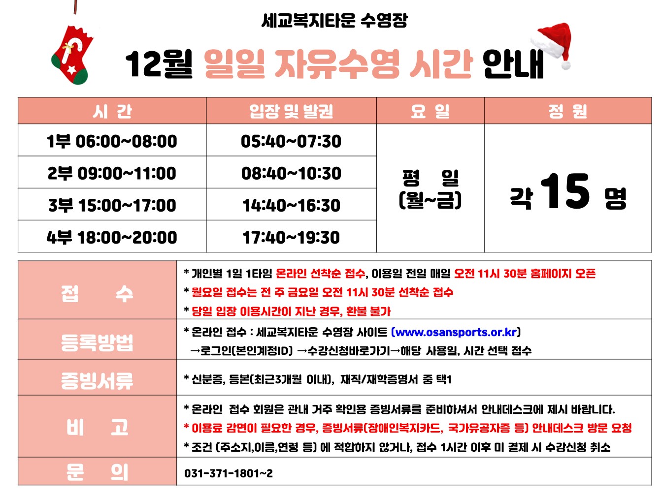 세교복지타운 수영장 12월 일일자유수영 안내 작성자 osansisul01 등록일자 2021년 12월 9일 15시 49분 52초 조회 591 2021년 12월 자유수영 개설.jpg [ Size : 264.08KB , Down : 193 ] 미리보기 다운로드 목록보기