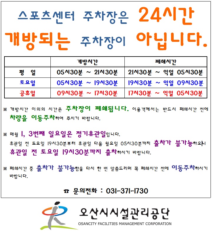 오산스포츠센터 오산스포츠센터 주차장은 24시간 개방되는 주차장이 아닙니다. 작성자 최고관리자 등록일자 2017년 11월 7일 13시 52분 38초 조회 4,390 주차장.jpg [ Size : 187.92KB , Down : 1,910 ] 미리보기 다운로드 목록보기