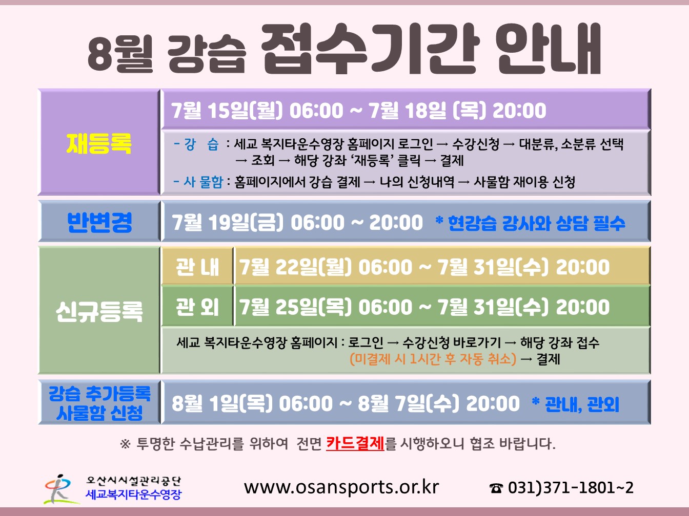 세교복지타운 수영장 [세교] 8월 강습 접수기간 안내 작성자 osansisul01 등록일자 2024년 7월 5일 20시 54분 37초 조회 634 8월 강습 접수기간 안내.jpg [ Size : 246.95KB , Down : 922 ] 미리보기 다운로드 목록보기