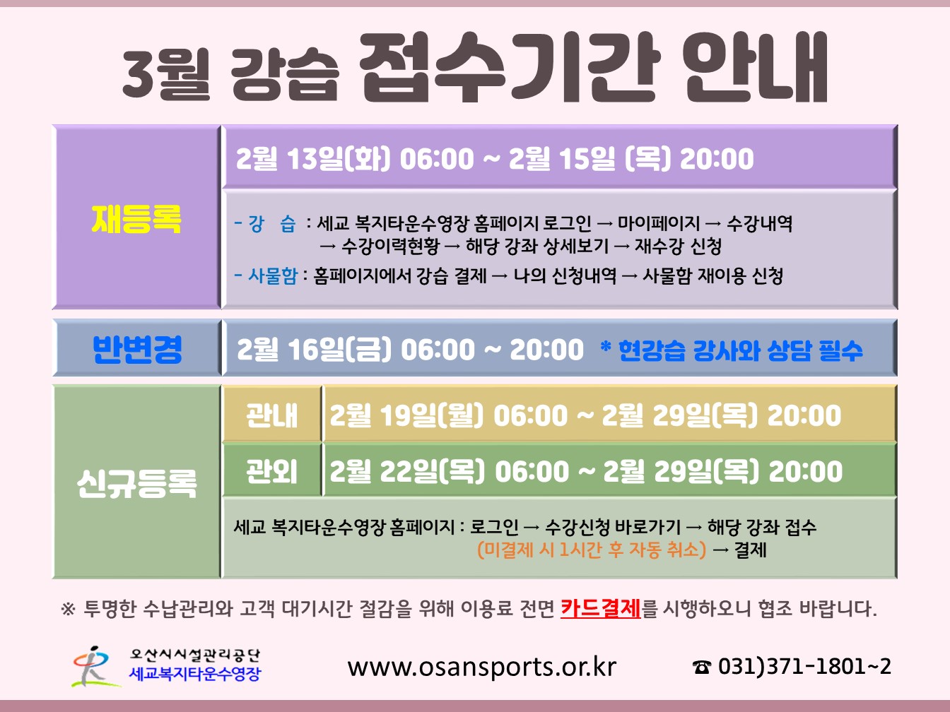 세교복지타운 수영장 3월 강습 접수기간 안내 작성자 osansisul01 등록일자 2024년 2월 5일 7시 57분 14초 조회 1,060 24.3월 강습 접수기간 안내.jpg [ Size : 221.34KB , Down : 1,926 ] 미리보기 다운로드 목록보기