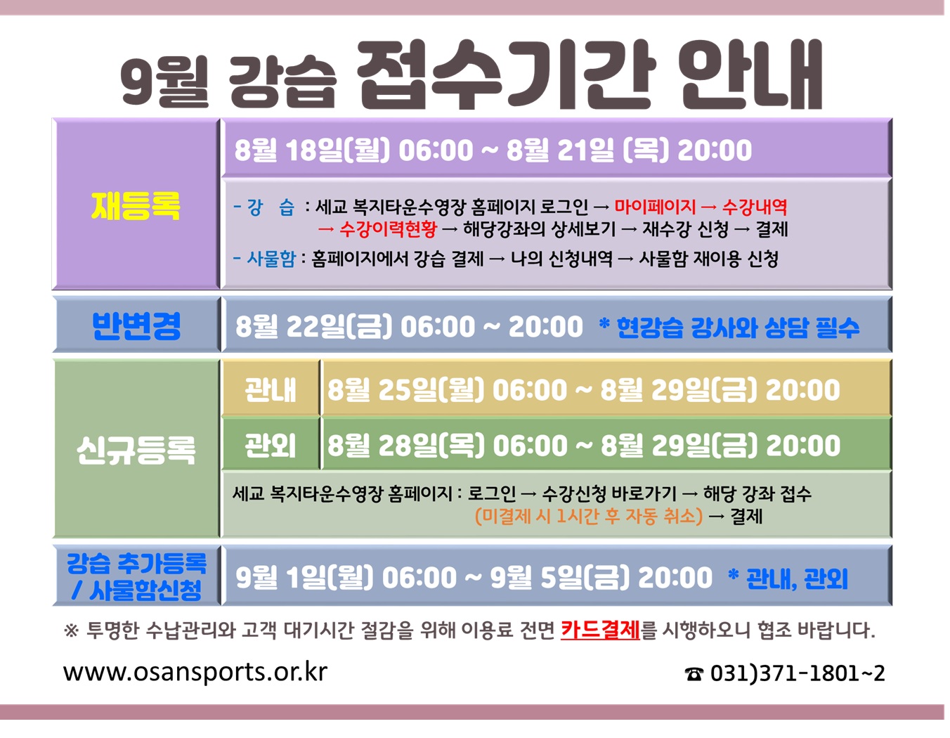 세교복지타운 수영장 [세교] 9월 강습 접수기간 안내 작성자 osansisul01 등록일자 2025년 8월 8일 13시 55분 28초 조회 1,103 9월 강습 접수기간 안내.jpg [ Size : 310.12KB , Down : 1,506 ] 미리보기 다운로드 목록보기