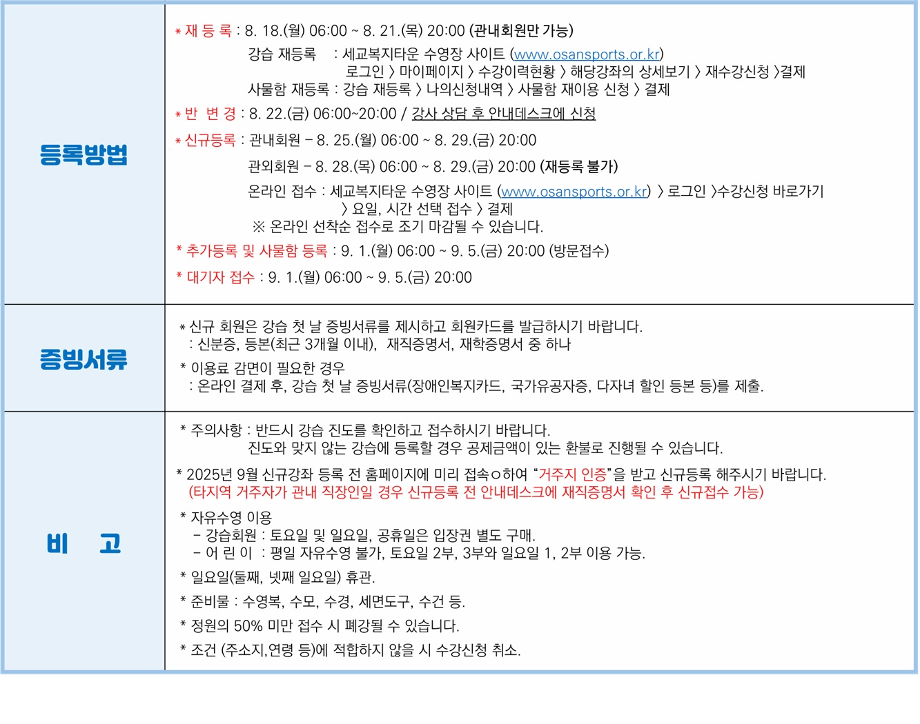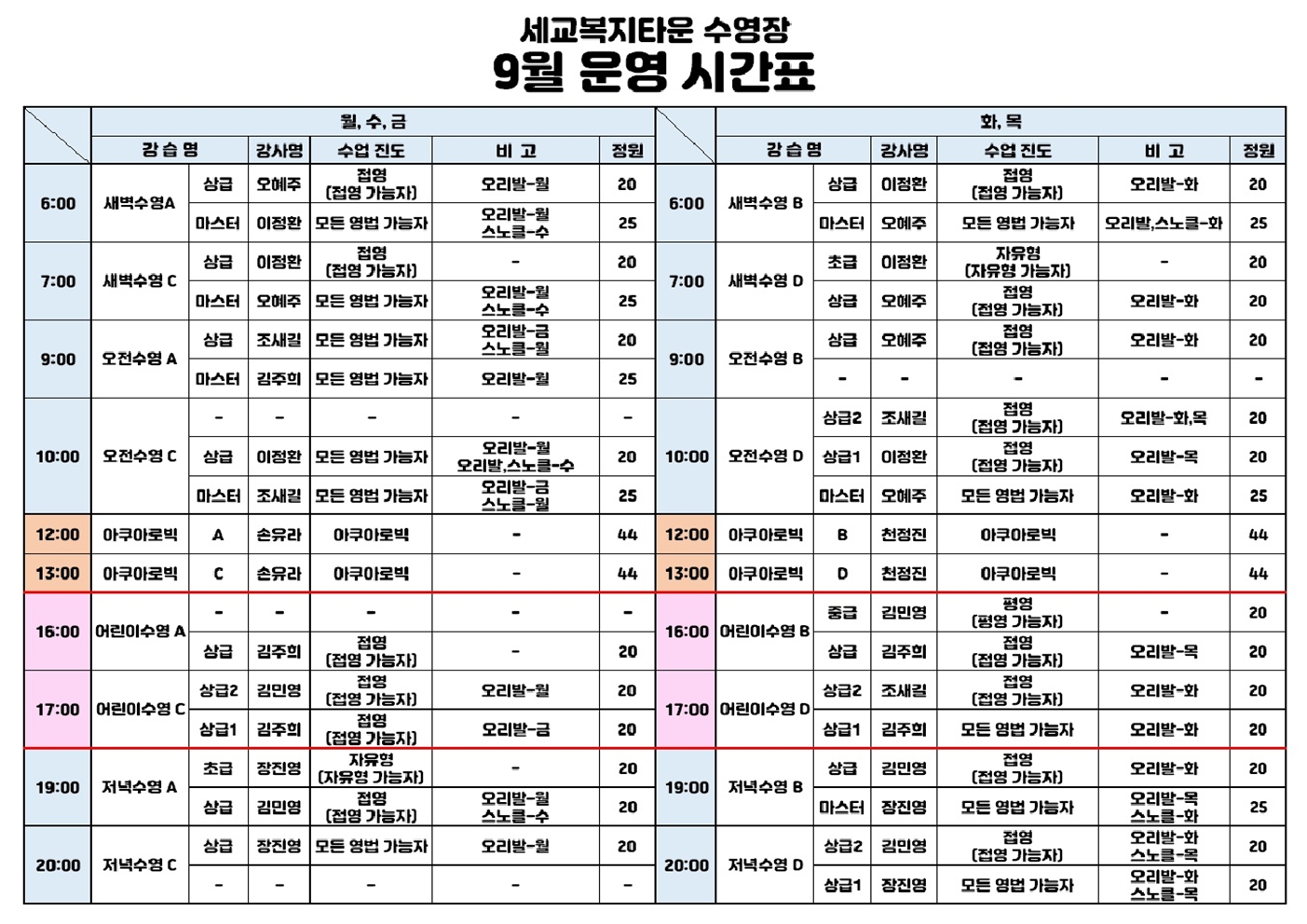 세교복지타운 수영장 [세교] 9월 강습진도표 작성자 osansisul01 등록일자 2025년 8월 14일 16시 33분 9초 조회 1,463 9월 진도표.jpg [ Size : 646.83KB , Down : 2,383 ] 미리보기 다운로드 9월 강습 접수기간 안내문.jpg [ Size : 321.96KB , Down : 2,093 ] 미리보기 다운로드 목록보기