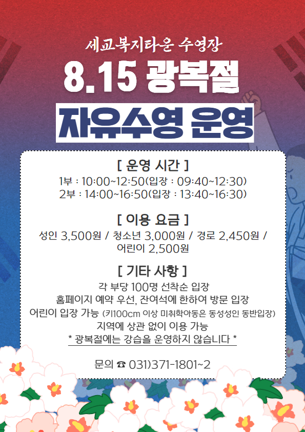 세교복지타운 수영장 [세교] 8월 15일(금) 광복절 자유수영 운영 안내 작성자 osansisul01 등록일자 2025년 8월 5일 5시 56분 53초 조회 569 광복절 운영 안내.jpg [ Size : 491.37KB , Down : 604 ] 미리보기 다운로드 목록보기