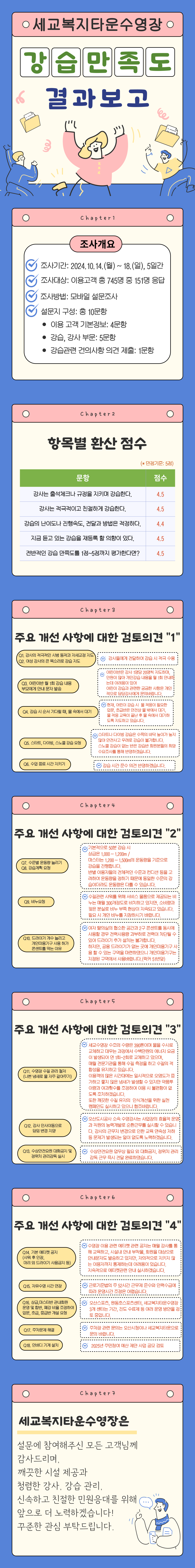 세교복지타운 수영장 2024년 세교복지타운수영장 강습만족도 조사 결과 공유 작성자 osansisul01 등록일자 2024년 11월 6일 9시 47분 46초 조회 1,531 안녕하세요. 세교복지타운수영장입니다.2024년 세교복지타운수영장 강습만족도 조사 결과를 공유합니다.귀한 시간 내어 주신 고객님들께 감사드리며, 더 나은 시설로 보답하겠습니다.자세한 결과는 *첨부파일을 확인해 주시기 바랍니다. 세교_강습만족도.png [ Size : 1.63MB , Down : 827 ] 미리보기 다운로드 목록보기
