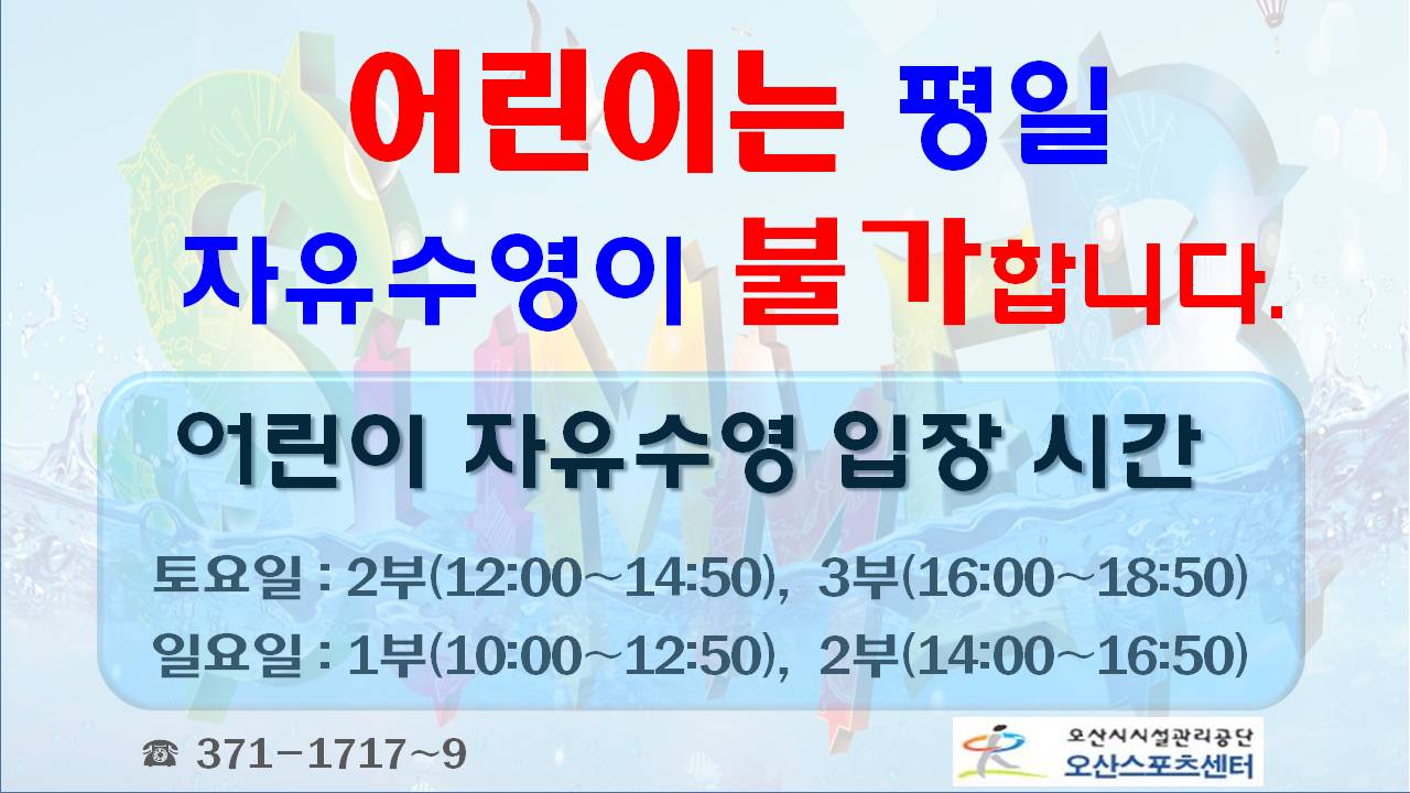 오산스포츠센터 어린이는 평일 자유수영이 불가합니다. 작성자 오산센터관리자 등록일자 2018년 8월 3일 10시 4분 43초 조회 2,207 1.jpg [ Size : 105.47KB , Down : 394 ] 미리보기 다운로드 목록보기