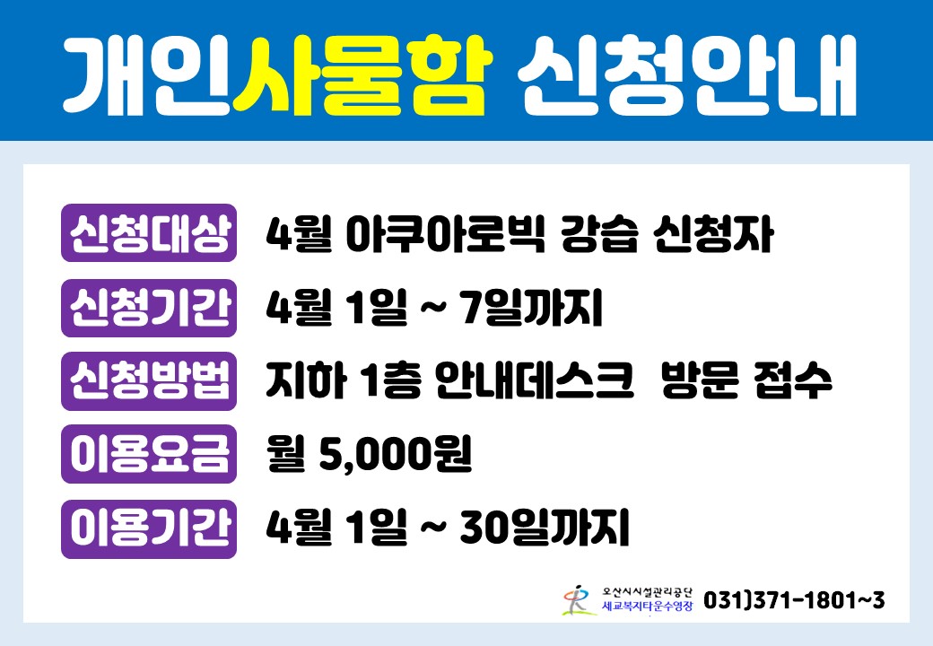 세교복지타운 수영장 4월 사물함 신청 안내 작성자 세교센터관리자 등록일자 2021년 3월 30일 8시 58분 38초 조회 195 4월 개인사물함 신청 안내.jpg [ Size : 133.46KB , Down : 132 ] 미리보기 다운로드 목록보기