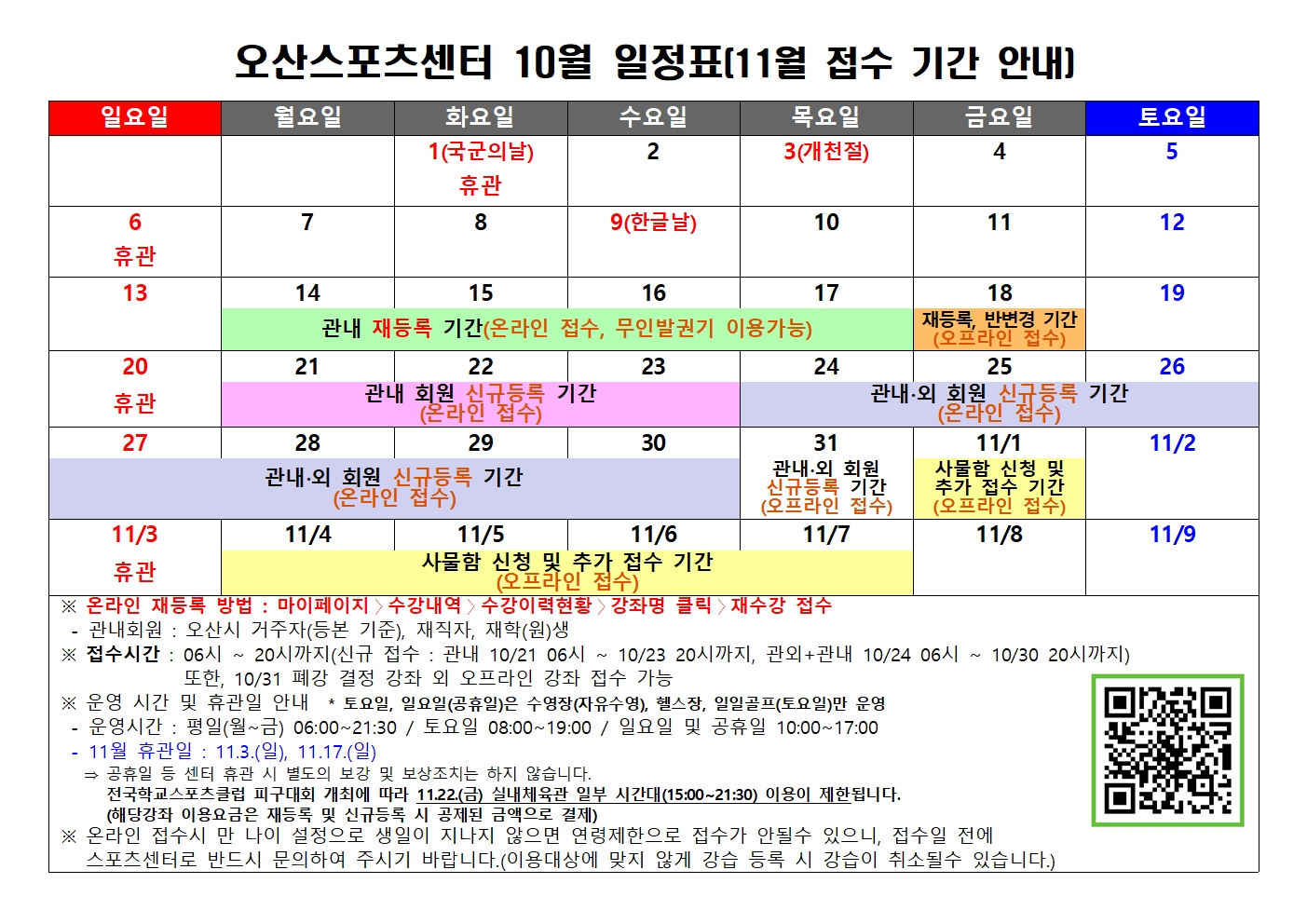 오산스포츠센터 오산스포츠센터 10월 일정표(11월 접수기간 안내) 작성자 osansisul03 등록일자 2024년 10월 11일 13시 35분 21초 조회 1,837 오산스포츠센터 10월 일정표(11월 접수 기간 안내).jpg [ Size : 725.09KB , Down : 2,707 ] 미리보기 다운로드 목록보기