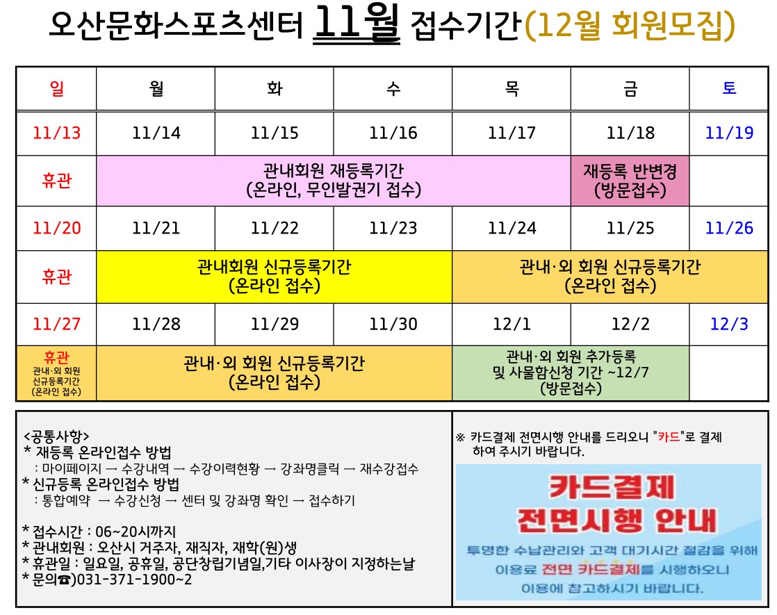 오색문화체육센터 오산문화스포츠센터 11월 접수기간(2022. 12월 강좌) 작성자 osansisul04 등록일자 2022년 11월 7일 17시 18분 1초 조회 496 . 11월회원모집(12월강좌).jpg [ Size : 230.08KB , Down : 986 ] 미리보기 다운로드 목록보기