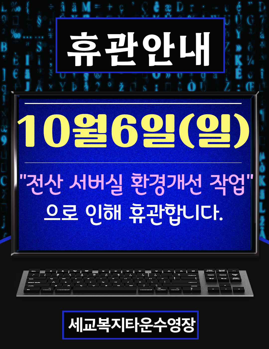 세교복지타운 수영장 [세교]10월 6일(일) 휴관일 안내 작성자 osansisul01 등록일자 2024년 9월 27일 7시 47분 49초 조회 660 [세교]10월6일 휴관.jpg [ Size : 1.53MB , Down : 821 ] 미리보기 다운로드 목록보기