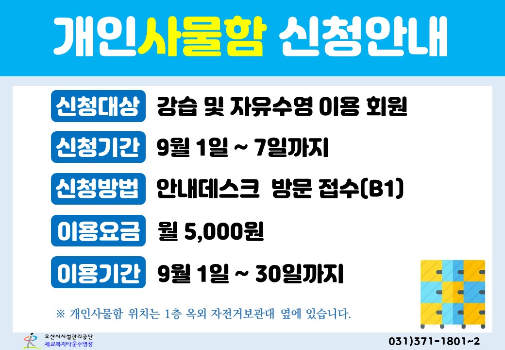 세교복지타운 수영장 개인사물함 신규등록 안내 작성자 osansisul01 등록일자 2022년 8월 30일 14시 9분 53초 조회 257 9월 개인사물함 안내.jpg [ Size : 140.46KB , Down : 238 ] 미리보기 다운로드 목록보기