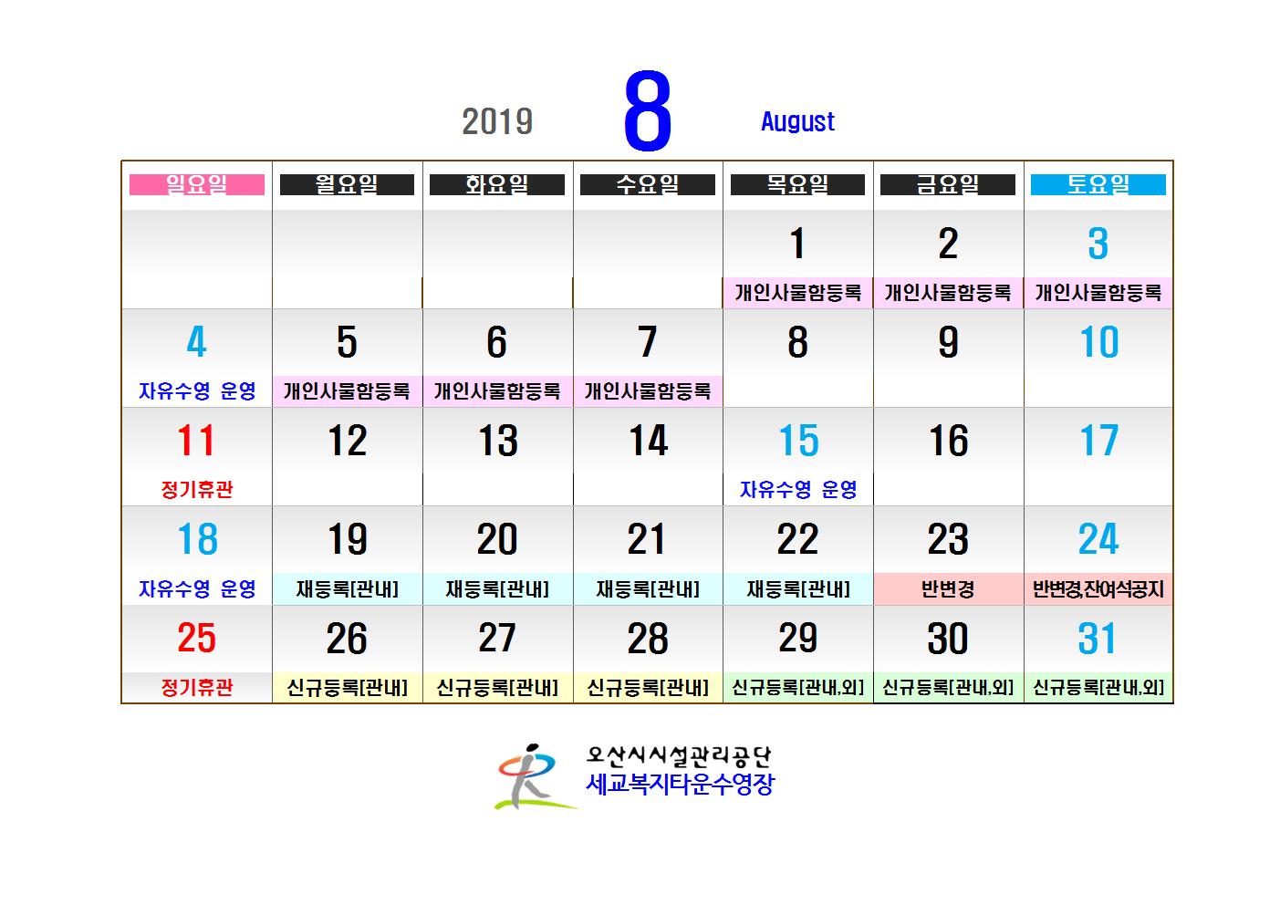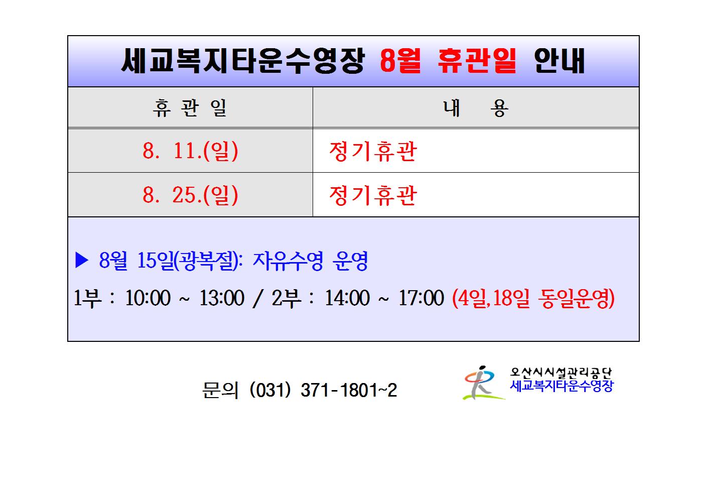 세교복지타운 수영장 8월 휴관일 안내 작성자 세교센터관리자 등록일자 2019년 7월 26일 11시 50분 22초 조회 727 8월달력.세교복지타운 수영장 휴관일 안내001.jpg [ Size : 129.1KB , Down : 125 ] 미리보기 다운로드 8월달력.세교복지타운 수영장 휴관일 안내002.jpg [ Size : 109.33KB , Down : 121 ] 미리보기 다운로드 목록보기