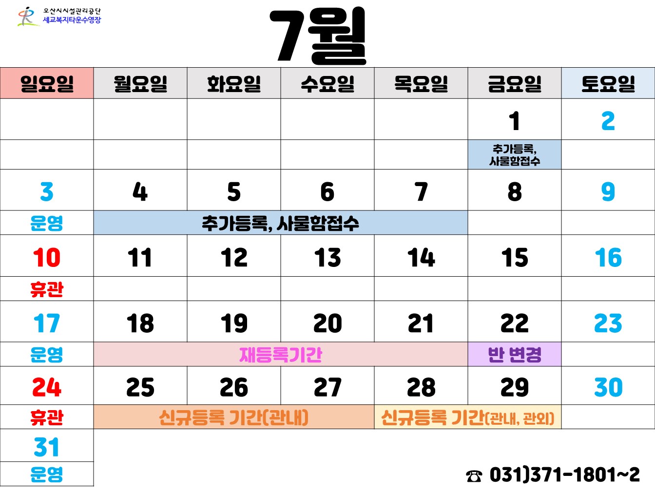 세교복지타운 수영장 7월 일정표(접수기간, 휴관일) 작성자 osansisul01 등록일자 2022년 6월 30일 20시 41분 40초 조회 865 7월 달력.jpg [ Size : 193.3KB , Down : 186 ] 미리보기 다운로드 목록보기