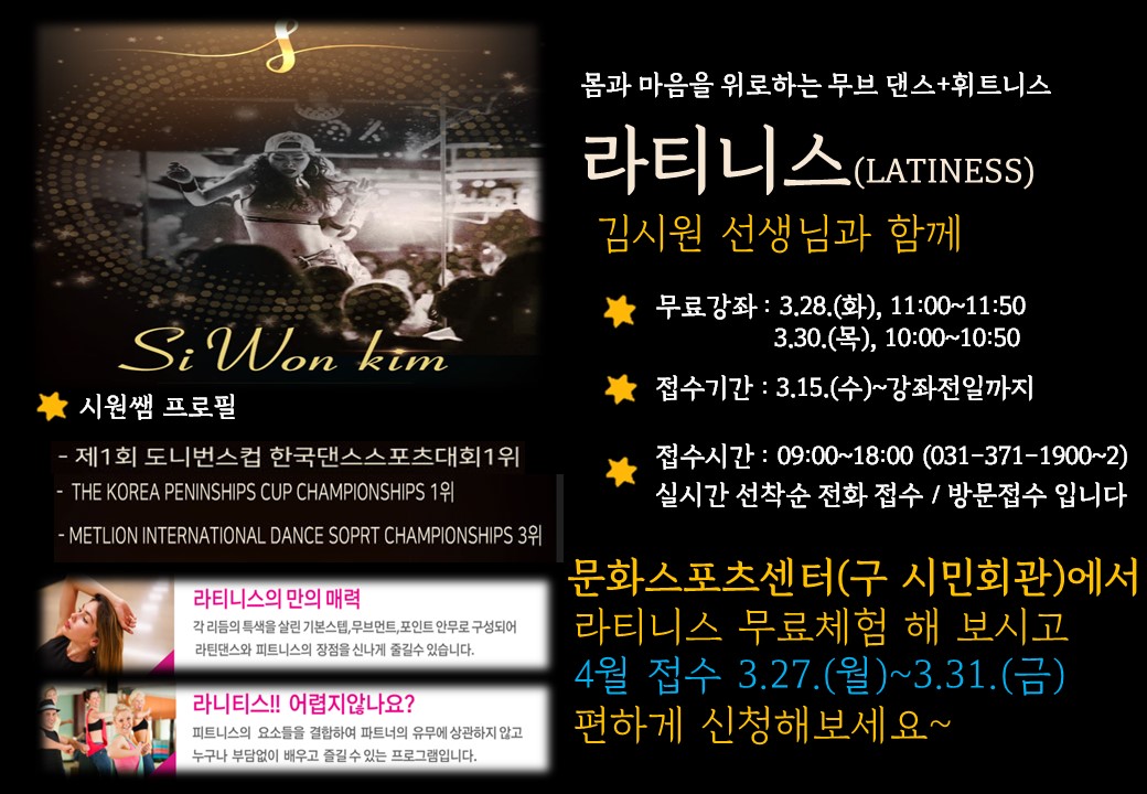 오색문화체육센터 문화스포츠센터 공개강좌 안내(라티니스) 작성자 osansisul04 등록일자 2023년 3월 15일 14시 34분 21초 조회 1,123 . 슬라이드1.JPG [ Size : 188.25KB , Down : 1,623 ] 미리보기 다운로드 목록보기