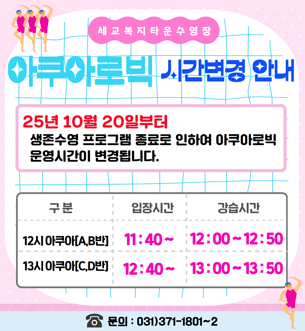 세교복지타운 수영장 [세교] 아쿠아로빅 강습시간 변경안내(10월 20일부터) 작성자 osansisul01 등록일자 2025년 10월 13일 12시 29분 4초 조회 207 [세교]아쿠아로빅 시간변경(25.10.20~).jpg [ Size : 800.63KB , Down : 237 ] 미리보기 다운로드 목록보기