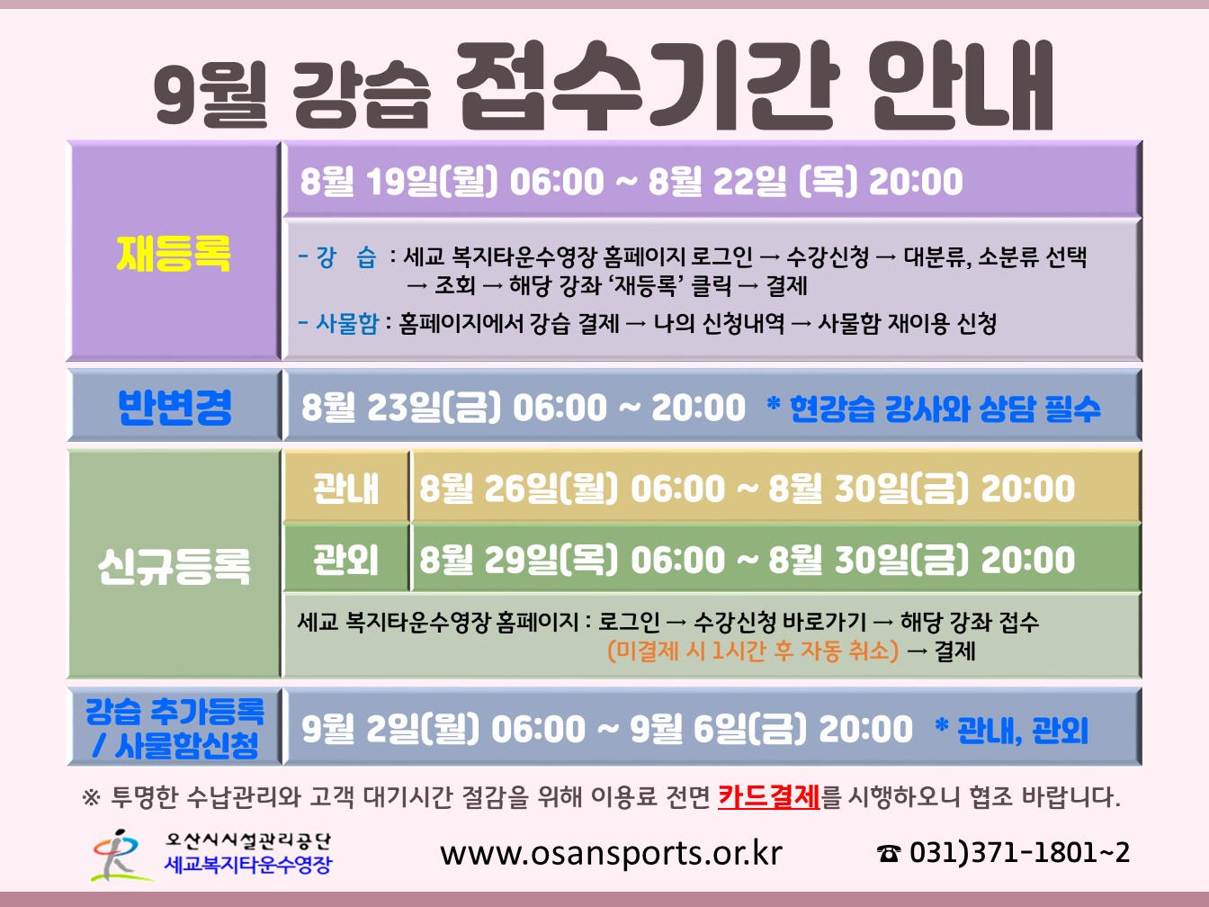 세교복지타운 수영장 [세교] 9월 강습 접수기간 안내 작성자 osansisul01 등록일자 2024년 8월 7일 17시 23분 21초 조회 869 9월 강습 접수기간 안내.jpg [ Size : 252.69KB , Down : 1,276 ] 미리보기 다운로드 목록보기