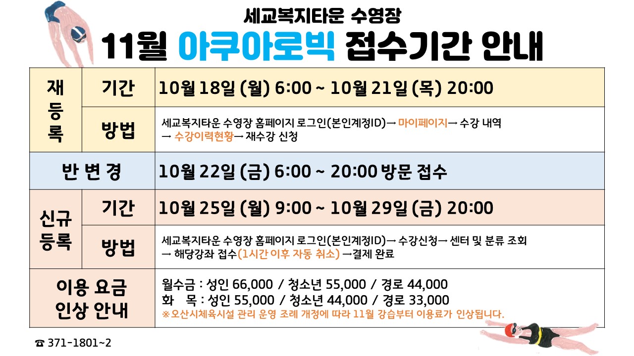 세교복지타운 수영장 11월 아쿠아로빅 접수 안내 작성자 osansisul01 등록일자 2021년 10월 13일 14시 55분 1초 조회 494 21. 11월 아쿠아로빅 접수기간 안내.jpg [ Size : 196.49KB , Down : 170 ] 미리보기 다운로드 목록보기