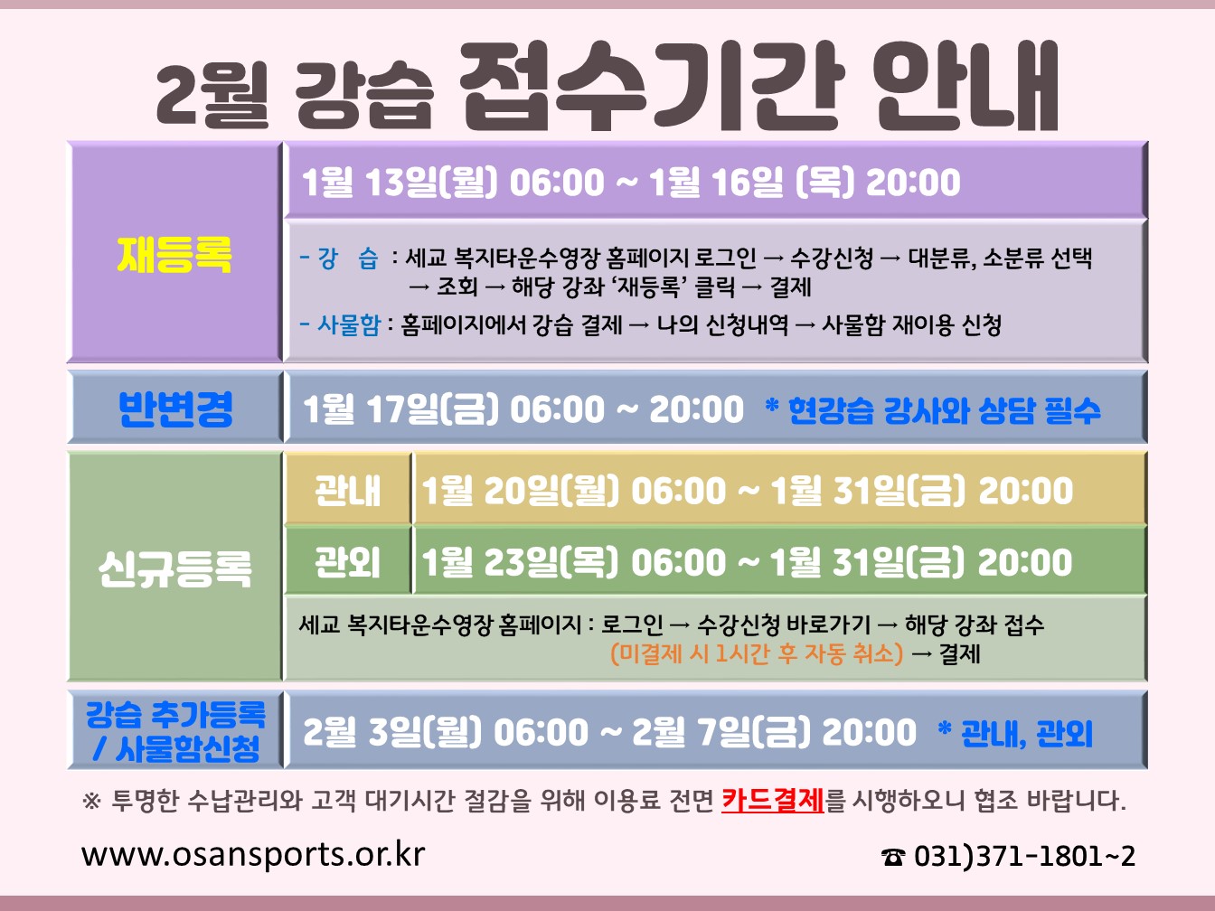 세교복지타운 수영장 [세교] 2025년 2월 강습 접수기간 안내 작성자 osansisul01 등록일자 2025년 1월 8일 17시 12분 11초 조회 517 25년 2월 강습 접수기간 안내.jpg [ Size : 242.02KB , Down : 735 ] 미리보기 다운로드 목록보기