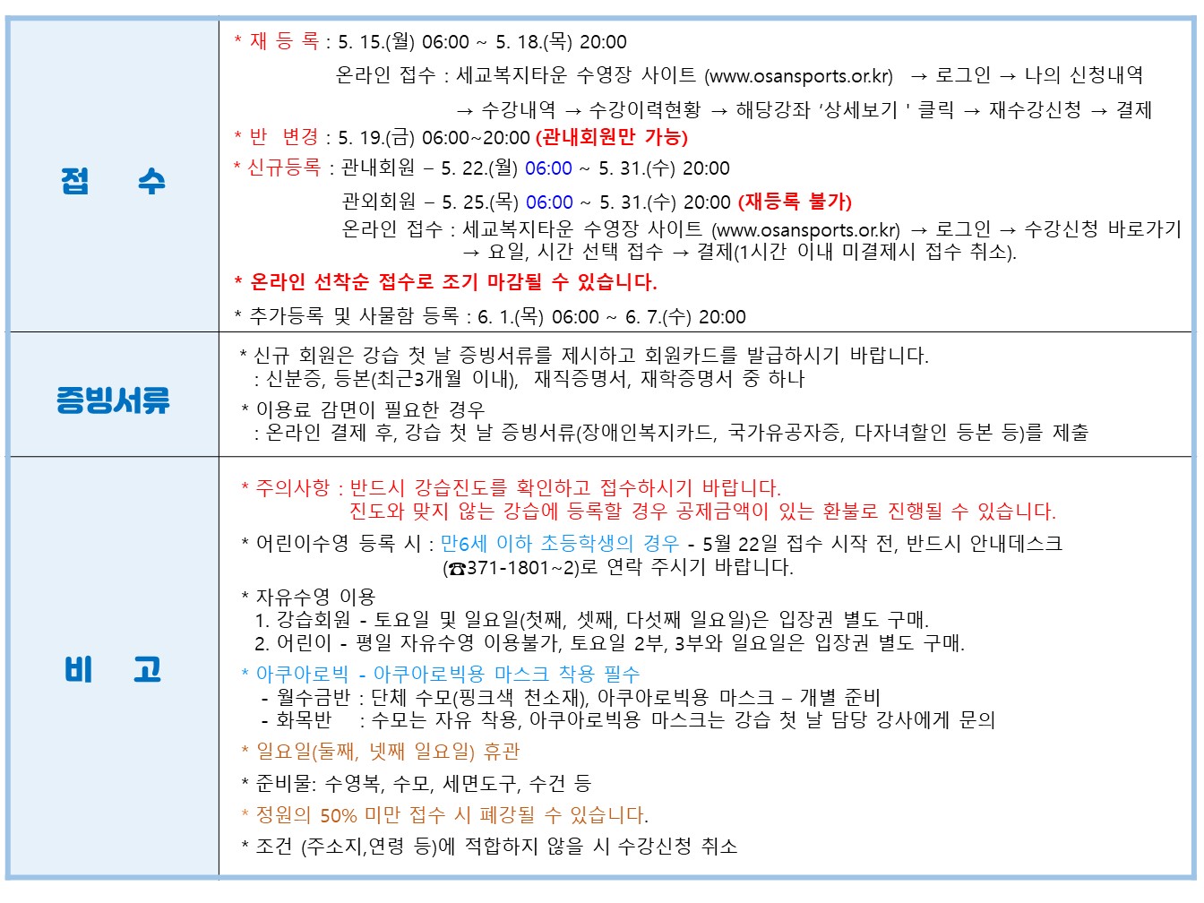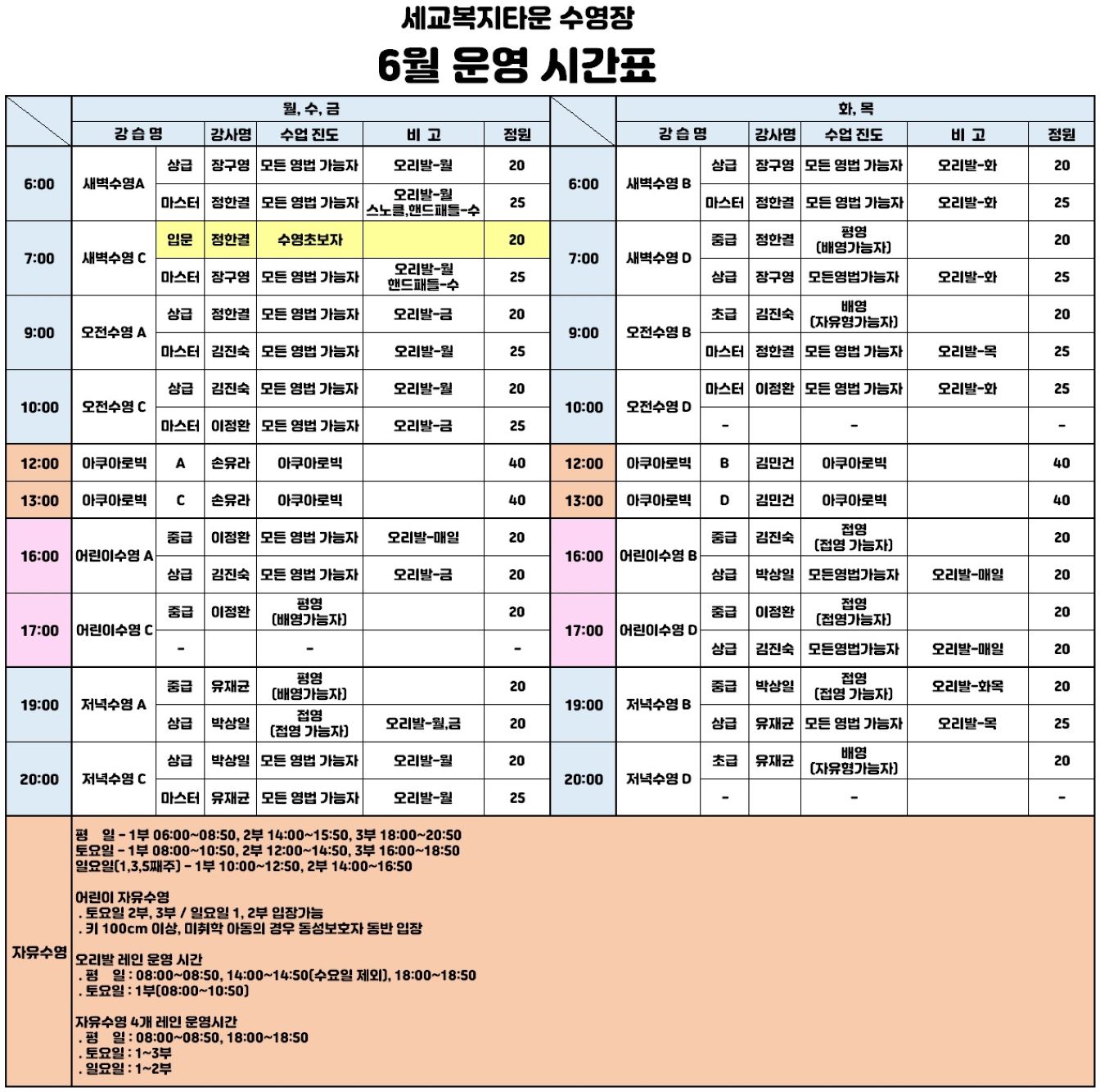 세교복지타운 수영장 6월 수영 강습 운영 시간표(강습진도표 포함) 작성자 osansisul01 등록일자 2023년 5월 16일 15시 53분 53초 조회 1,173 6월 운영시간표(홈페이지-크기조정).jpg [ Size : 295.87KB , Down : 1,834 ] 미리보기 다운로드 23년 6월 수영 접수 안내.jpg [ Size : 288.16KB , Down : 1,633 ] 미리보기 다운로드 목록보기