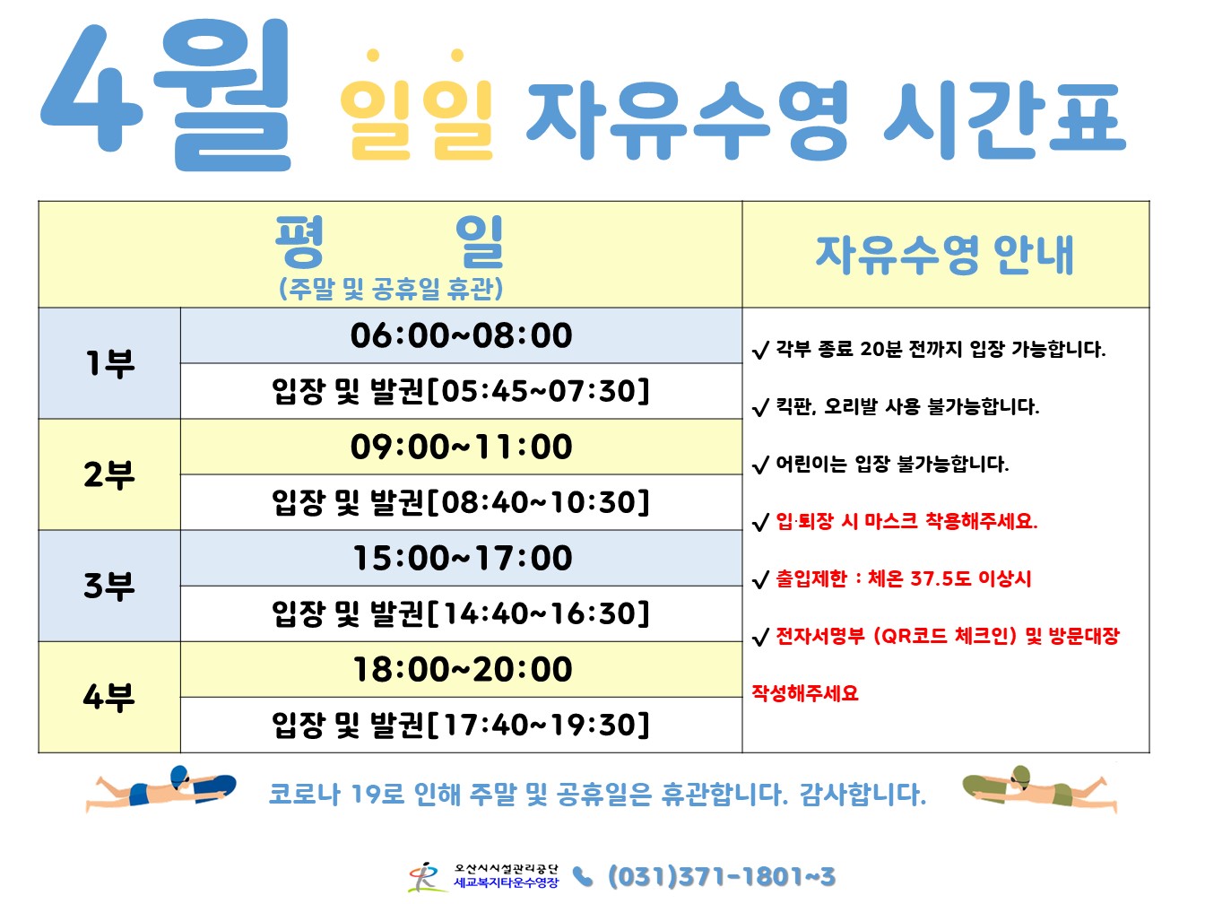 세교복지타운 수영장 4월 일일 자유수영 시간표 작성자 세교센터관리자 등록일자 2021년 3월 30일 20시 38분 50초 조회 426 2021 자유수영 시간표 2.jpg [ Size : 208.57KB , Down : 140 ] 미리보기 다운로드 목록보기