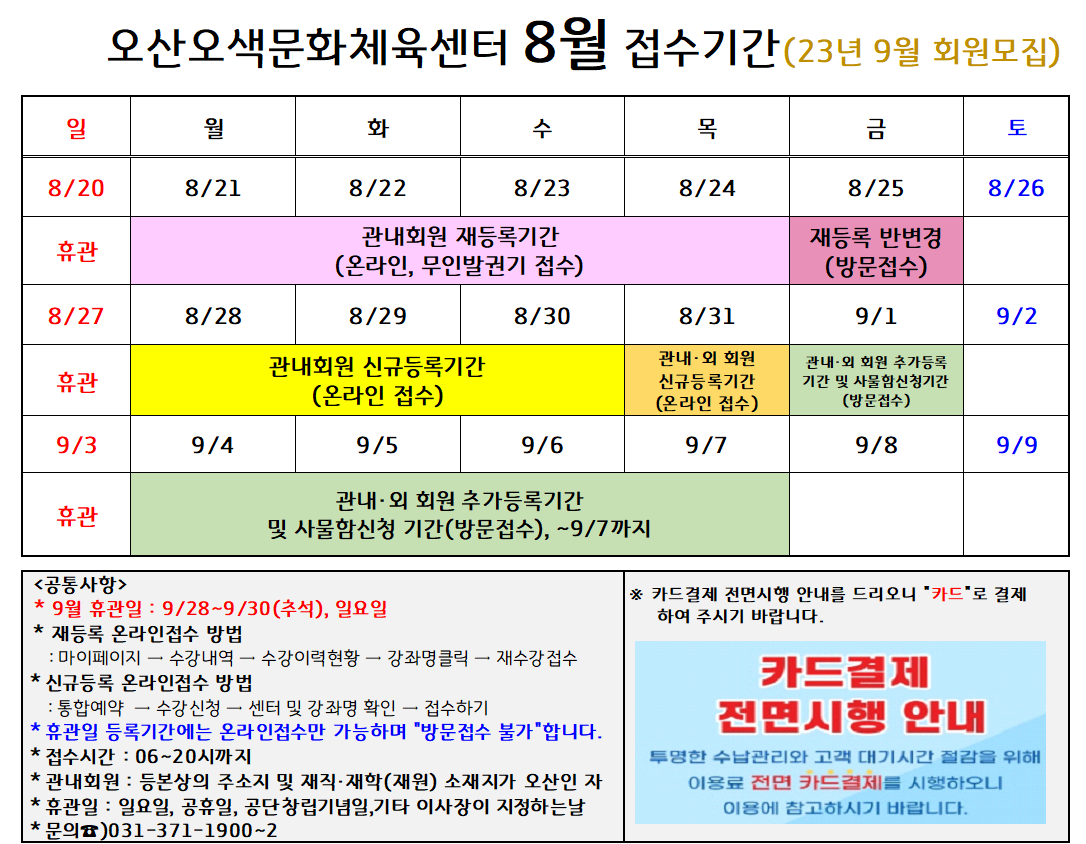 오색문화체육센터 오산오색문화체육센터 8월 접수기간(2023. 9월 강좌) 작성자 osansisul04 등록일자 2023년 8월 7일 16시 46분 51초 조회 702 . 2023.8월접수기간(9월강좌).png [ Size : 181.04KB , Down : 1,821 ] 미리보기 다운로드 목록보기