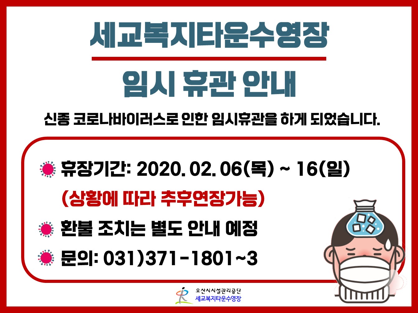 세교복지타운 수영장 신종 코로나바이러스로 인한 임시휴관 작성자 세교센터관리자 등록일자 2020년 2월 4일 21시 18분 34초 조회 959 공지 양식(j).jpg [ Size : 210.17KB , Down : 140 ] 미리보기 다운로드 목록보기