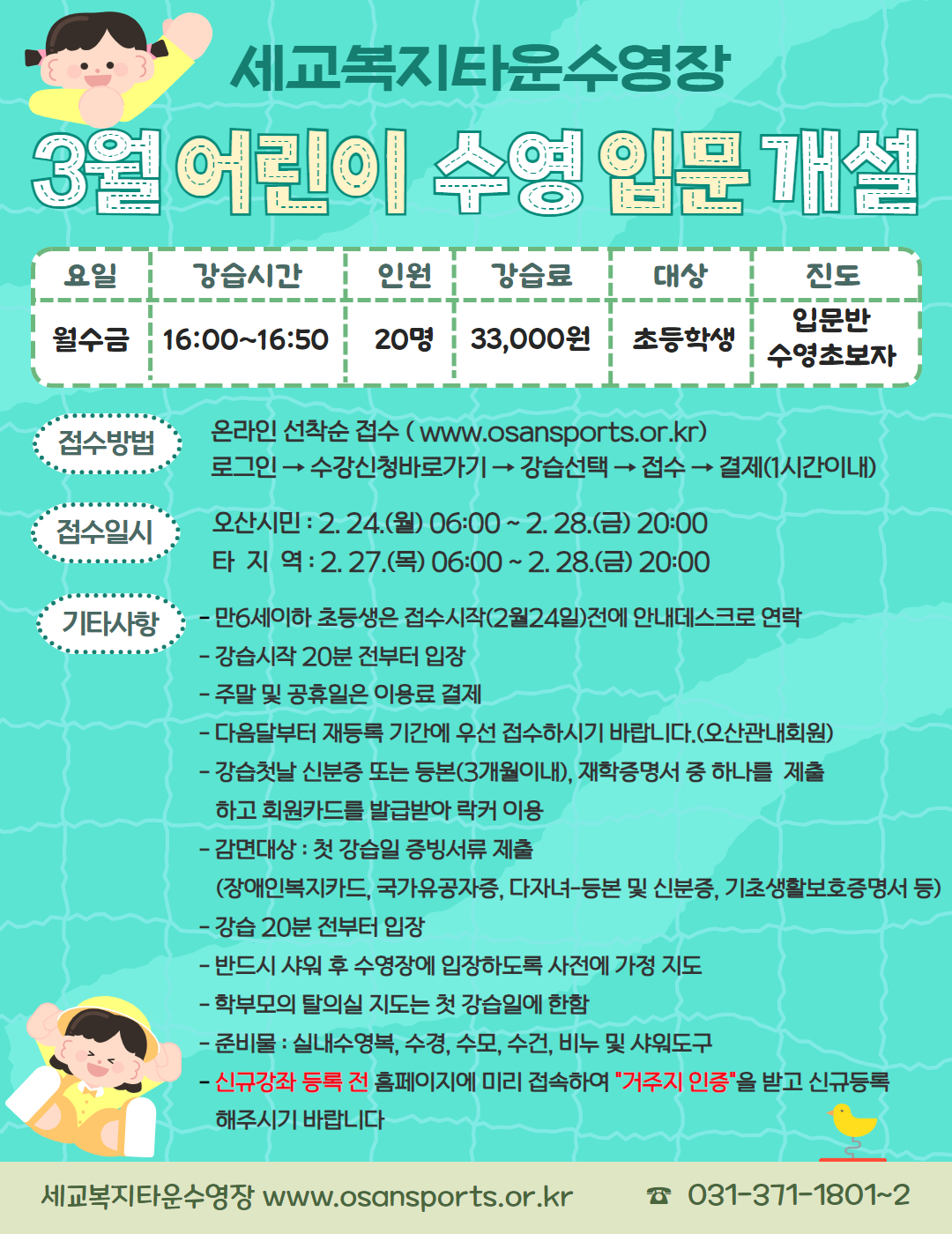 세교복지타운 수영장 [세교] 3월 어린이 입문반 개설 작성자 osansisul01 등록일자 2025년 2월 10일 20시 37분 23초 조회 826 3월 어린이입문-종.jpg [ Size : 1.2MB , Down : 1,089 ] 미리보기 다운로드 목록보기