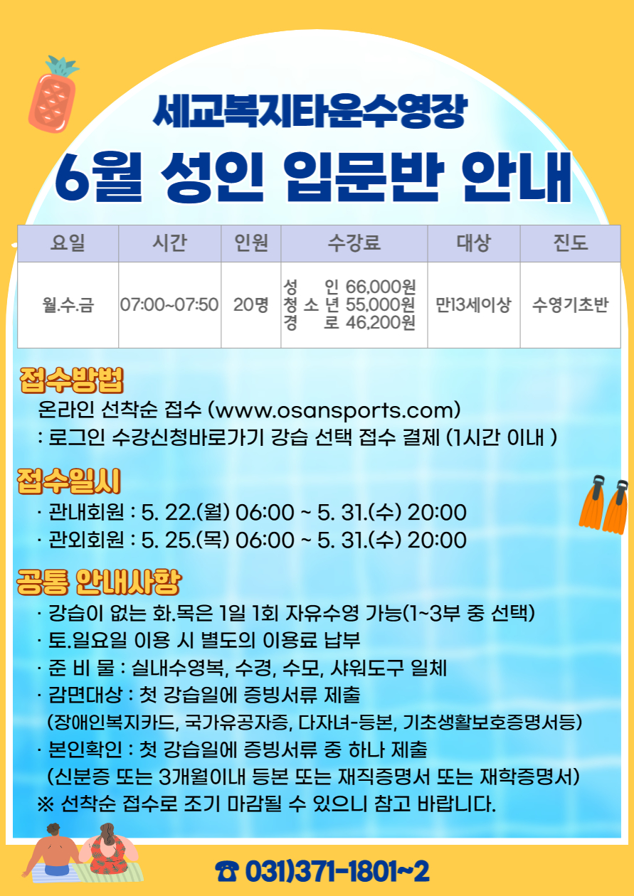 세교복지타운 수영장 6월 성인 입문반 개설 안내 작성자 osansisul01 등록일자 2023년 5월 18일 17시 31분 46초 조회 2,408 6월 수영입문(게시용).jpg [ Size : 867.14KB , Down : 3,633 ] 미리보기 다운로드 목록보기