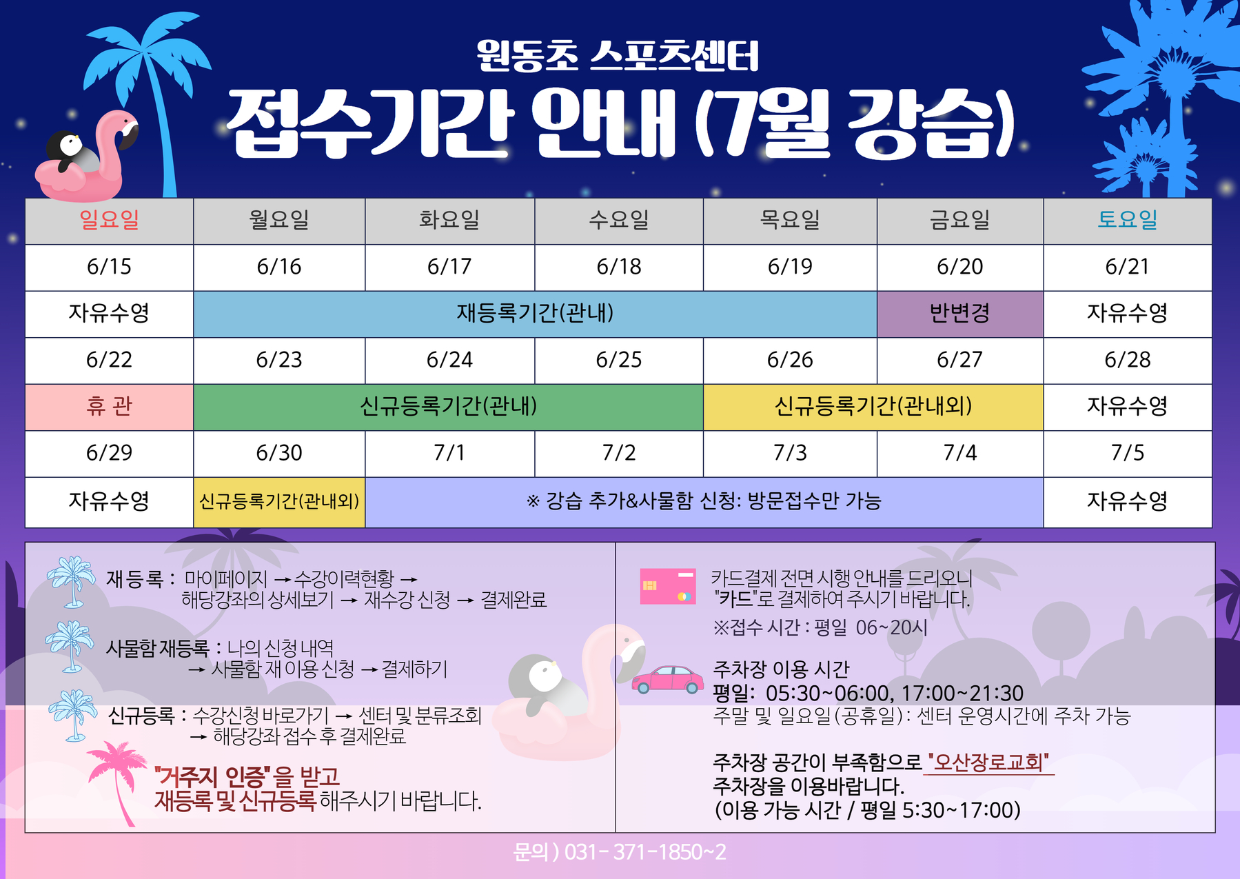 원동초 스포츠센터 [원동] 7월 접수기간 안내 작성자 osansisul02 등록일자 2025년 6월 11일 11시 43분 11초 조회 722 접수기간안내_7월강습_원동.jpg [ Size : 1.07MB , Down : 770 ] 미리보기 다운로드 목록보기