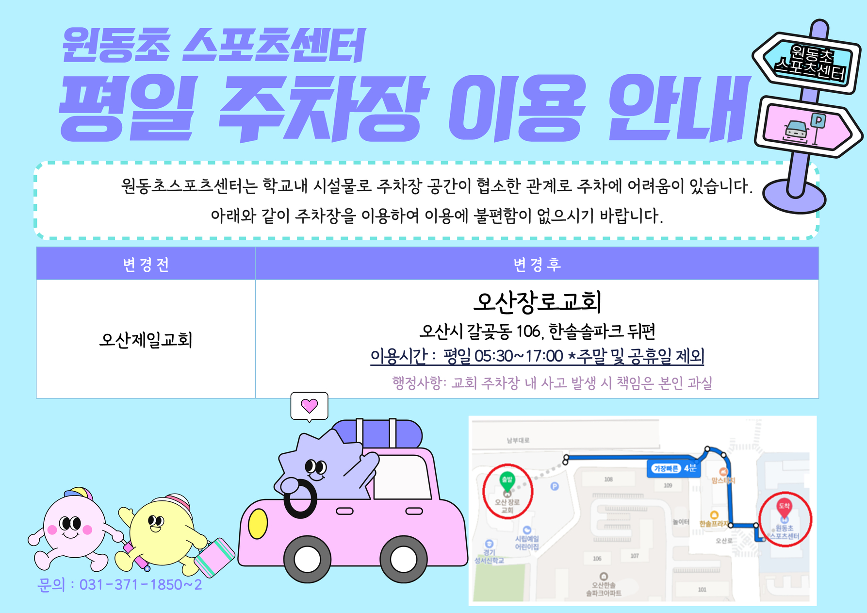 원동초 스포츠센터 [원동] 원동초 스포츠센터 평일 주차장 이용 안내 작성자 osansisul02 등록일자 2025년 3월 6일 5시 52분 35초 조회 694 평일주차이용안내.jpg [ Size : 862.25KB , Down : 746 ] 미리보기 다운로드 목록보기